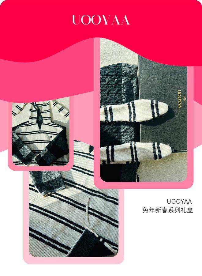 兔牌在手,兔运当头。收到礼盒的那一刻,编辑们就被UOOYAA 设计心爱住了! 新春心意焕新,UOOYAA将“兔兔”与针织分离,新春欢乐平和的氛围流转于兔耳条纹背心之上,将“兔”这一元素精炼与重构,融入复古色系中进行全新演绎,为复古美学注入现代新意。重构的长耳玩具兔形象,童趣又有艺术感,大面积的撞色拼接设计也极具视觉抵触感,曾经等不迭穿上展示心爱了~