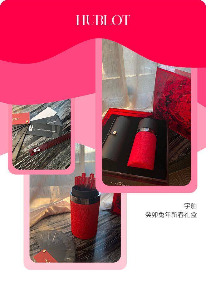 瑞兔献福,禧启新年,HUBLOT携手中国著名壁画艺术家文那以中国传统古历法中的“十二地支”概念创作出生动在不同时辰里的瑞兔作为礼盒的外观,搭配红色的亚克力材质外壳亦彰显兔年蓬勃旺盛的新气候。 翻开礼盒,今年HUBLOT给编辑们准备了乐趣十足的签文,简直不要太细节!连新年和家人朋友们聚会的文娱项目都布置妥了,装签文的签筒也是细节至深,签筒上的雕琢就是不装签文都能够当做一件装饰品放在家中,另外,HUBLOT的红包都是与众不同,涟漪式交互式设计带来愈加丰厚的兴味性,在宇舶时间里传送高兴心情的重生,纵享新年的每刻精彩。