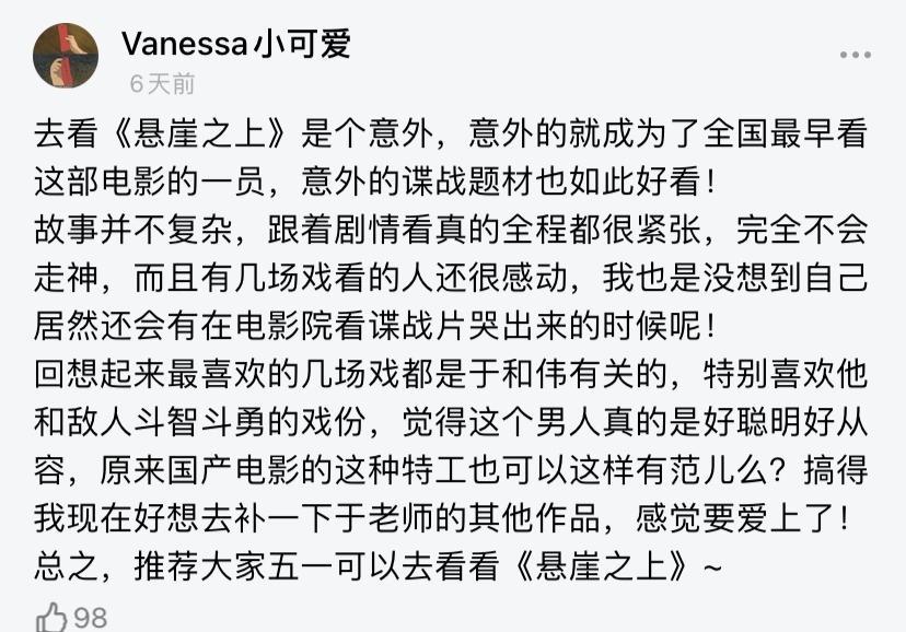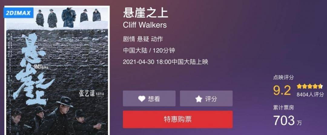 没想到我有一天会为一部谍战片而哭。 在电影院看《悬崖之上》时,几次红了眼眶,几次听到了其他人的哭声,又几次把眼泪咽了回去,可是在结尾的时分,我还是忍不住哭成了个“傻子”。 缘由无他,就是“感人”二字。 这是张艺谋的第一部谍战片,从我在电影院看到的观众反响来看,电影无疑是胜利的,点映开分双爆,淘票票9.1,猫眼9.2,口碑炸裂。