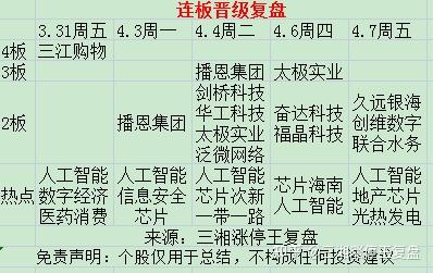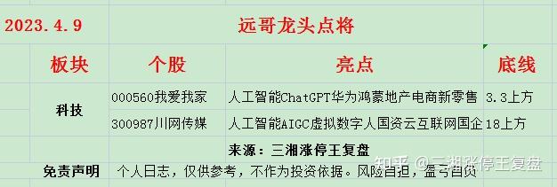 一日一签:2023年4月9日 物随心转,境由心造。修好自己的心,温暖善良,宽厚豁达,积极乐观,淡定从容。向阳而生,逐光而行,心若愉快,生活处处是阳光。 一、周末消息:10新股明天上市! 1、主板注册制首批10只新股4月10日明天上市 2、券商降低备付金比例从16%到15%,定向降准释放资金超百亿 3、al通义千问大模型开始测验。京东版ChatGPT今年将发布。 4、深js发布涉算力、卫星导航等8条指数 5、学生总体近视率和体质健康状况纳入考核 6、特斯拉将在上海建造储能超级工厂 7、元宇宙房产跌幅90% 8、日本爆发禽流感疫情 二、市场情绪:TMT大科技情绪高昂! 1、沪指6连阳,逼近2月以来横盘高点上沿,大有一鼓作气直接突破的势头。深成指创业板指连续站上5日线约半月,最强的是科创50指数。原本流动性不足的科创板,因为本轮科技股,中芯国际寒武纪等权重直接助力,科创508连阳,15天13阳。科技牛市,从数字经济到人工智能! 2、风格:趋势股、20CM主导。连板3家,高度2板。趋势股代表有佰维存储、寒武纪、中文在线、新易盛、金桥信息、久远银海等。TMT,为科技、媒体、通信。3月下旬以来,市场越发结构化。TMT科技成交额大约占总成交占比超40%。4月6日,TMT成交量达到48%。趋势股风格依然呈现压倒性优势。连板风格相对较为低调,当然趋势股的中间往往也有涨停或近20cm大涨。周末消息无特别之处总体仍是国内阿里华为各个大模型的讨论、以及明天新股的猜谜等。远哥依然维持月初观点,4月中上旬相比下旬更容易赚钱! 三、涨停复盘:趋势股、20cm风格主导目前市场 1、空间板高标和趋势标 今年5板以上高标:安妮股份、通达动力、泰永长征、弘业期货、恒久科技、达意隆、智能自控、同为股份、汉王科技、鸿博股份、九牧王、华脉科技、中润资源 2023年以来主板涨幅前列:剑桥科技、三六零、久远银海、金桥信息、大华股份、上海电影、拓维信息 2023年以来创业板科创板涨幅前列:佰维存储、寒武纪、云从科技、昆仑万维、海天瑞声、新易盛、光云科技、神州泰岳、中际旭创、拓尔思、汤姆猫、浩瀚深度、万兴科技、中文在线、每日互动 4月涨幅前列:佰维存储、源杰科技、山大地纬、联合水务、久远银海、新易盛、奋达科技、万达信息、福晶科技、富春股份、博创科技、神州泰岳 2、周五涨停连板 ![]() 3、连板晋级复盘 ![]() 4、代表性涨停 科技趋势+涨停+20cm板:佰维存储、中文在线、神州泰岳、朗玛信息、 科技趋势+涨停+主板:金桥信息、剑桥科技、上海电影、世纪华通、奥飞娱乐、天马股份、新华网、中兴通讯 科技加速板:润欣科技、德生科技、东软集团 地产:我爱我家、国创高新、天保基建 光热发电:首航高科、久盛电气、三维化学 四、热点主线:AI+堪比13年的移动互联网+ 科技细分:数字经济、人工智能、软件、芯片、信息安全、信创、数据中心、元宇宙等 科技英文:TMT、AI、ChatGPT、VR、6G、CPO、AIGC、NFT AI应用:软件、电商、游戏、传媒、影视、金融、教育、人脸识别、智能交通、机器人、医药、地产等 其他板块:次新、摘帽、送转、业绩预增、国企、一带一路基建、赛道、消费等 国企细分:央企、地方国企;通信、汽车、能源、建筑、消费、金融等国企 1、人工智能、数字经济、软件、芯片、CPO、信息安全等科技 从消息面看,周末消息无特别之处,主要仍集中在国内外科技巨头入局大模型军备竞赛。百度文心一言,华为盘股,阿里通义千文,腾讯混元,京东等等。目前AI+行情堪比13年的移动互联网+。数据要素+数字基建两大基石,AI引发第四次科技革命。AI应用涉及诸多场景,软件、游戏、电影、金融、医药、地产等等 从板块细分和个股看,人工智能、数字经济、软件、芯片、CPO本轮涨幅较高,持续较强。从风格看,以20cm趋势主导,10cm趋势为辅,主板连板要么快打快灭要么成为趋势股上升途中的一个过程。从远哥以往点将看,2月曾点将青木股份和3月股池力盛体育,都获得了约50%的涨幅。从潜力看,远哥3月潜力股池的荣信文化、3.21点将的华是科技、远哥4月潜力股池的世纪天鸿都是创业板+AI+个股,仍有一定潜力或趋势仍有一定吸引力。今天,远哥再就AI+大科技点将,挖掘,探索! 2、次新业绩预增摘帽等其他板块 其他板块一:次新业绩预增摘帽送转。其他板块二:一带一路基建、光热发电地产等。科技之外,目前就是这些板块了。次新明天10股上市,以后打新会没那么容易,但主板注册制的第一批新股上市理论应该都有溢价的,哪个到底会炒作着实有难度,但科技+属性的相对更有看点。核准制新股结束了历史,远哥4月股池的联合水务上周尾还来个连板,炒新变得难度提高了。摘帽和业绩预增,远哥也有ST林重备选,就看年报了。周五A股,除了科技,还有光热发电和地产,能否撬动科技之外的资金?预计市场在科技的疯狂之中,其他板块压缩后也会有一定的机会。 ![]() 五、龙头点将策略 1、龙头点将总策略 总策略:截断亏损,让利润奔跑。 总方针:打板接力、低吸潜伏、趋势跟踪为三种交易风格,殊途同归 2、2023年一季度龙头点将亮点部分回顾 若羽臣(12.25点将)、中兴商业、智能自控(12.26点将)、中通国脉、云鼎科技(1.3点将)、真视通(2.5点将)、物产金轮、地铁设计(2.7点将)、青木股份(2.10点将)、力盛体育(2.28,3月股池)、恒锋信息(3.9点将)、盛通股份(3.19点将) 3、龙头点将更新 