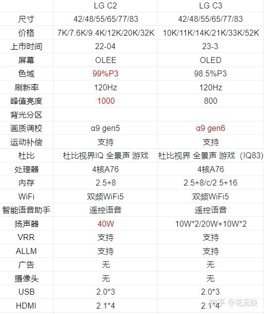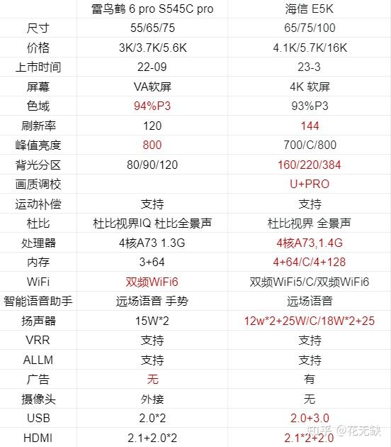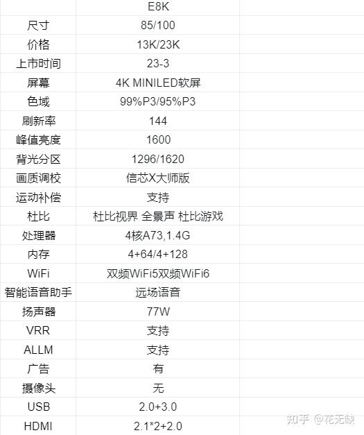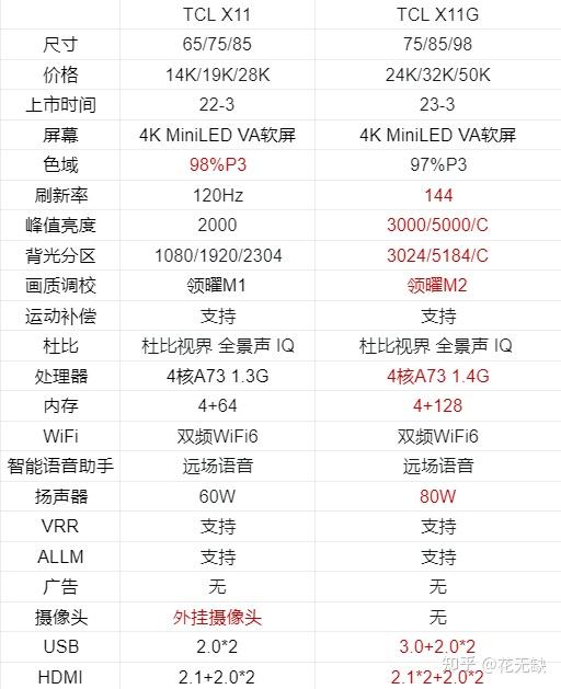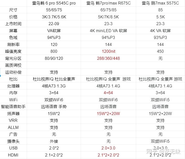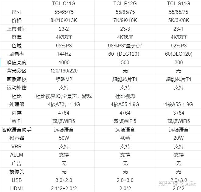 今年3月份差不多出了20多款电视,包含了绝大部分一线品牌,我做了部分参数收集与往年电视相比,看看哪些是挤牙膏,哪些是真材实料大升级。 另外,国内很多品牌都用上了pentonic700芯片,144Hz,双满血HDMI2.1,一个USB3.0接口成为主流。 更新了一个选购避坑文章,买电视前可以看看,有用的话可以点个赞( ) 花无缺:电视选购小技巧,商家的套路有哪些? 一、TCL 1.C11G/P12G/S11G ![]() 这三款可以称为TCL线下三兄弟,价格是京东价,高得离谱,没有参考意义。 C11G的配置不错,但距离去年Q10G还差点意思,如果线上价格腰斩,可以考虑。 P12G很像我在电视避坑文章中提到的假量子点,没有控光分区,峰值亮度低,却宣传自己是量子点电视,谨慎购买( ̄▽ ̄)。 S11G配置很低,跟雷鸟S365C差不多,线上价格腰斩也差点意思,不推荐购买哦。 2.T8E MAX ![]() 去年T8E MAX的升级款,低亮度,无控光分区,量子点应该和T8E一样,也是假的,性价比不高,不推荐。85吋的用上了pentonic700,但依旧性价比不高,还是不推荐(`⊿)。 3.Q10G Pro ![]() Q10GPRO性价比非常高,是我目前最推荐的机型。相比于Q10G,峰值亮度和控光分区几乎翻了一倍,双HDMI2.1接口,USB3.0接口,升级非常大,但价格是去年Q10G的预售价,可以说是基本没加价。 缺点:85吋是惠科屏,但影响不大;有人反映第二个HDMI2.1接口似乎不支持4K 144Hz输入,不知是不是N卡原因,但厂家后续应该会有更新,可以等618再看看。 4.X11G ![]() X11G应该是今年的旗舰款了,配置高,价格也高,与去年旗舰X11对比,有升级有减配,主要升级了峰值亮度和控光分区,双HDMI2.1接口。但性价比不如Q10G pro,不差钱追求更好画质的朋友可以考虑一下。 5.T7H ![]() 和去年的98Q10G差不多,用上了pentonic700芯片,降了峰值亮度,我的建议是再加两千块,直接上98Q10G pro(˙˙)。 二、索尼 X80L/X90L ![]() 索尼今年的产品就有点不够看,属于是挤牙膏了,基本没有太大升级。 X80L不推荐,索尼的低端机型,买索尼大多都是图它的调校技术和游戏适配性,这款没有XR芯片,也没有HDMI2.1接口,远远不如同价位的国产。 X90L目前只有55,65两个尺寸,峰值亮度和控光分区略有增加(是真抠啊),金属边框(这算升级吗),而且目前溢价比较高,没有性价比(虽然索尼也不跟性价比沾边),建议选老款X90K,不过可以期待一下之后的其他尺寸()。 三、海信 1.E5K ![]() 相较于去年的E5H,E5K做了全方位的升级,但E5H不推荐购买,所以E5K这次与去年性价比很高的鹤6pro作比较。 对比来看,E5K的硬件配置比鹤6pro是要强一点的,再加上画质调校上面很好,虽然加了几百块,也是值得购买的。 2.E8K ![]() 弥补了去年E8H没有大屏的遗憾,整体来看配置很强,控光分区比Q10Gpro要多一些,峰值亮度低一点,不过加上海信一流的画质调校技术,虽然贵了一千,但也是值得买的。 四、雷鸟 鹤7/鹏7 ![]() 今年的雷鸟就有点差强人意了,峰值亮度拔高了400nit,控光分区翻了3倍,但价格也贵了1千多,性价比还行,但色域上没什么提升,感觉差了那么点意思,可以买。 鹏7目前只有85吋,低价低配,跟红米的MAX86差不多,一个软屏,一个有控光分区,预算较低喜欢大屏的朋友可以考虑。 五、LG ![]() 说实话原本还挺期待LG新品的,但一看参数,这不就是C2吗,甚至比C2还差了一点。根据官方所说,主要在软件上进行了升级,也就是α9芯片,面板配置什么没变,但软件是可以后续更新的。所以说如果你手里有C2,后续可能升级为更强的C3,属实有点小丑了乛乛。不过G3也快上市了,据说峰值亮度2000+,值得期待一手。 今年新品就介绍到这里了,如果后续有什么好的新品,我会在618之前会持续更新(-)。 总结:值得买的有:TCL Q10G pro,海信E5K,海信E8K,雷鸟鹤7,雷鸟鹏7,TCL X11G 电视避坑:花无缺:电视选购小技巧,商家的套路有哪些? 数据收集整理不易,求点赞支持(`) |