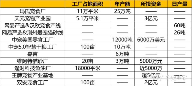 基于宠业家日更的报道,此前曾给大家整理过2022年宠物行业的八大发展趋势,其中宠物公司建厂仍是当下宠物市场的潮流之一,近期玛氏亚洲宠食工厂一期完成规划验收、网易严选宠粮独立产线落成、天元投建宠物产业园等无不印证这一发展趋势。 在各大品牌纷纷开启建厂模式的今天,小编借此机会给大家盘点一下最近两年,纷纷布局宠物工厂的宠物企业&品牌,具体内容如下: ![]() (以上表格根据已有公开数据整理) 玛氏——天津经开区宠食工厂 ![]() 2023年4月,玛氏宠物食品工厂项目一期完成规划验收,该项目位于天津经开区南港工业区,是该区的重点项目,一期工厂占地约11万平方米,满产后年产能可达25万吨以上,项目建成后,将成为玛氏亚洲最大的现代化宠物食品工厂,这也是玛氏继1995年在中国率先设立宠物食品生产线、2007年首家宠物食品工厂投产后,在华投建的第三家宠物食品工厂,并将首次实现宠物食品生产的智能化和绿色化。 天元宠物——投建宠物产业园2023年4月3日,天元宠物以1747万元成功竞得杭州市临平区20亩产业发展用地,天元宠物发布公告称将规划在该地块打造宠物产业园,项目直接投资预计不超过3亿元,总建筑面积约5.1万平方米,其中地上建筑面积约3.3万平方米;地下建筑面积约1.8万平方米,满足公司未来发展需求。 天元宠物将利用该项目,打造具有总部办公、产品开发、宠物服饰和窝垫的柔性制造、宠物产品线上及线下销售、公司电子商务及信息化建设、产品展示及消费场景体验等功能的宠物产业园。 网易严选——宠粮独立产线2023年3月31日,网易严选宣布与山东汉欧合作建设的首条宠粮独立产线、宠物营养研究与应用联合研发实验室启用。该产线位于山东临沂,将主要承担冻干双拼猫粮等严选爆款产品的生产,日产量达60吨。 ![]() 据官方介绍,除与汉欧合作建设的宠粮独立产线外,3月20日,网易严选与湖北爱宠合作建设的猫砂独立产线、猫砂联合实验中心正式启用,主要承担四合一混合猫砂、3毫米豆腐猫砂等产品生产,日产量达26吨。3月29日,网易严选宠物手套独立产线启用,主要承担宠物SPA保湿免洗手套等产品生产。 内蒙古派森——今年投产使用2023年,柔驰集团旗下内蒙古派森宣布正式投产使用,该工厂于2022年投建,主打鲜奶制品、奶制品罐头、猫条、酱包等高端宠物湿粮产线产品。 ![]() 据悉,内蒙古派森是柔驰集团重点发力的高端化宠物湿粮产品工厂,位于“中国乳都”之称的呼和浩特市,特色原料——鲜奶,选自大牌同源,从牧场采集到工厂成品加工,整个生产过程仅需3小时。 王牌宠物——投建宠物产业基地3月6日,青岛王牌动物健康产品有限公司在胶州胶莱镇举行了上合王牌国际健康产业基地建设项目奠基仪式,产业基地项目总投资过5亿元,建成后预计年销售额达15亿元。 该项目一期建设的是王牌宠物食品智慧工厂,是王牌宠物集团计划投产的第3个现代化工厂。 中宠——投建美国第二工厂2023年3月31日,中宠股份发布公告称旗下控股孙公司美国Jerky将以不超过6000万美元投资建设美国第二工厂项目,项目主要用于烘干类、风干类等宠物零食生产设备采购、安装、调试及厂房改造等工作,项目建成达产后将实现12000吨的产能。 中宠方面表示该项目将有利于填补中宠在美国市场的产能缺口,提高其海外业务的增量,满足海外客户的需求,提升公司市场竞争力及盈利能力。 中宠——5.0智慧干粮工厂 ![]() 2022年4月8日中宠旗下5.0智慧干粮工厂正式投产,该项目于2020年9月28日正式开工建设,占地100亩,设计年产能最高可达10万吨。工厂由谷物原料入仓车间、鲜肉预处理车间、鲜肉加工,干粮智慧生产线以及智能立体仓库四个车间组成。 工厂两条全套干粮生产线均由全球两大顶级宠物干粮设备制造商之一的瑞士布勒(BUHLER)承建。 福贝——募资5.67亿元用于工厂、研发中心建设2023年3月,福贝更新招股说明书,拟募资5.67亿元,将用于宣城福贝宠物食品扩建项目、智能仓储配送中心建设项目、营销及管理信息化建设项目以及研发中心建设项目。 2022年2月19日,福贝股份中心工厂生产基地暨福新公司年产25万吨高端宠物食品项目奠基仪式在安徽宣城市举行。 乖宝——募资6亿建厂 ![]() 2023年3月,乖宝披露最新的招股说明书(注册稿),拟募资6亿元用于宠物食品生产基地扩产建设项目、智能仓储升级项目等。 蓝馔——美国工厂扩建 ![]() 2023年3月23日,宠食品牌蓝馔在印第安纳州里士满的宠物食品工厂宣布扩建破土动工,该公司计划在未来两年内投资2亿美元,为工厂增加16.9万平方英尺的加工业务和仓库容量,到2024年底,此次扩建将创造约60个新工作岗位。 逢时科技——透明磷虾鱼油工厂投产 ![]() 2023年1月,逢时(青岛)海洋科技有限公司旗下国内磷虾油行业最大的“透明工厂”时透明工厂在山东青岛建成投产。该透明工厂占地18000平方米,总投资近5000万,拥有10万级GMP净化生产车间,是国内最大规模的磷虾油生产透明工厂。 雀巢普瑞纳——扩建克林顿宠食工厂 ![]() 2022年10月5日,雀巢普瑞纳宣布对美国克林顿宠食工厂现有设施进行扩建,拟投资1.56亿美元,旨在扩大普瑞纳的整体产能和生产能力。 中誉宠物——二期工程开工建设 ![]() 据中誉方面介绍,占地面积约8万平方米的中誉宠物食品漯河产业园二期工程已于2022年开工建设,以鲜肉为主打的烘焙粮、膨化