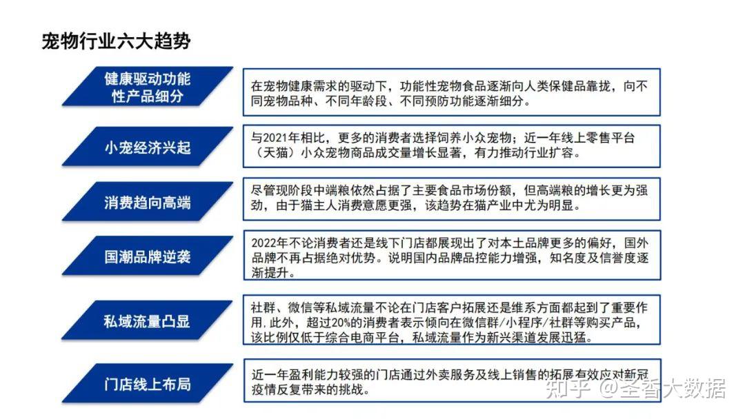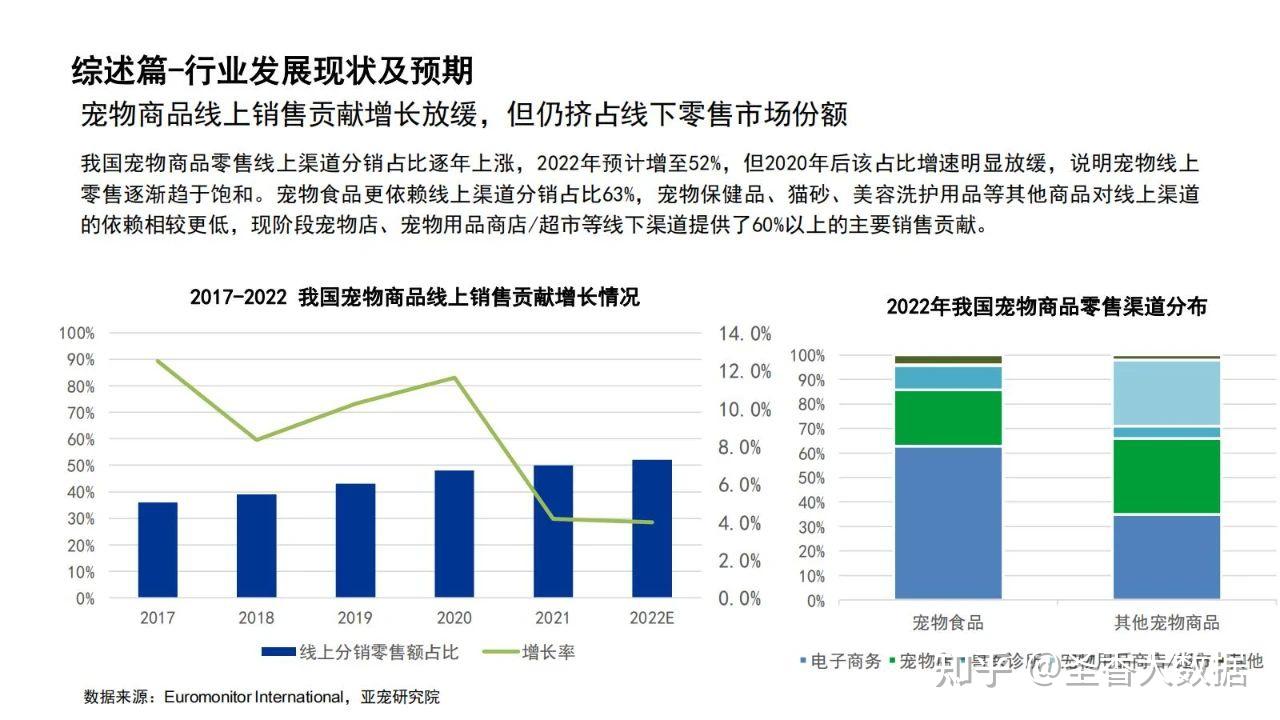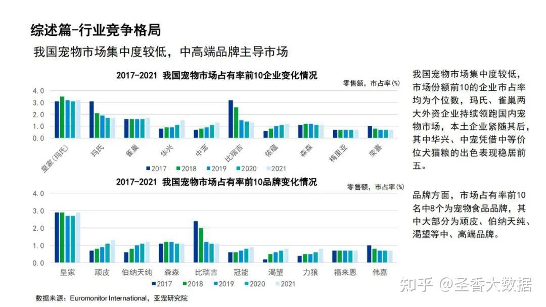 摘要:2022年我国宠物饲养类型中犬猫仍为主流占比75%,持续主导宠物食品、用品等消费市场。猫狗数量占比相差较小,猫数量略高于狗数量,随着猫数量的持续上升,养猫产生的相关消费需求将随之增加。 2017-2019年狗数量始终高于猫数量,2019年后狗数量受城镇大中型犬管控等影响出现负增长,随着适宜城市饲养的小型犬数量近5年以年均5.6%的增速增加,预计2022年狗数量将恢复正增长趋势。 2017-2021年我国宠物市场高速发展,2021年宠物市场规模达到1500亿元,随着更多的人加入养宠大军,以及养宠理念的不断升级,未来宠物市场将持续蓬勃发展,2022年宠物市场规模预计达1706亿元。 我国宠物商品零售线上渠道分销占比逐年上涨,2022年预计增至52%,但2020年后该占比增速明显放缓,说明宠物线上零售逐渐趋于饱和。宠物食品更依赖线上渠道分销占比63%,宠物保健品、猫砂、美容洗护用品等其他商品对线上渠道的依赖相较更低,现阶段宠物店、宠物用品商店/超市等线下渠道提供了60%以上的主要销售贡献。 我国宠物市场集中度较低,市场份额前10的企业市占率均为个位数,玛氏、雀巢两大外资企业持续领跑国内宠物市场,本土企业紧随其后其中华兴、中宠凭借中等价位犬猫粮的出色表现稳居前五。 品牌方面,市场占有率前10 名中8个为宠物食品品牌,其中大部分为顽皮、伯纳天纯、渴望等中、高端品牌。 来源:天猫宠物 ![]() ![]() ![]() ![]() ![]() ![]() ![]() ![]() ![]() ![]() ![]() ![]() ![]() ![]() ![]() ![]() ![]() ![]() 关于我们 我们是一家专注于分享国内外各类行业研究报告/专题热点行业报告/白皮书/蓝皮书/年度报告等各类优质研究报告分享平台。所有报告来源于国内外数百家机构,包含传统行业、金融娱乐、互联网+、新兴行业、医疗大健康等专题研究.....目前已累积收集近80000+份行业报告,涉及众多大板块,多个细分领域。 内容涵盖但不限于(市面上有的基本都有): 1、互联网运营、新媒体、短视频、抖音快手小红书等等; 2、房地产、金融、券商、保险、私募等; 3、新技术(5G)、金融科技、区块链、人工智能类; 4、电子商务、市场营销、运营管理、麦肯锡、德勤等; 5、快消品、餐饮、教育、医疗、化妆品、旅游酒店、出行类等; 免责声明: 本平台只做内容的收集及分享,报告版权归原撰写发布机构所有,由圣香智库社群通过公开合法渠道获得,如涉及侵权,请联系我们删除;如对报告内容存疑,请与撰写、发布机构联系。