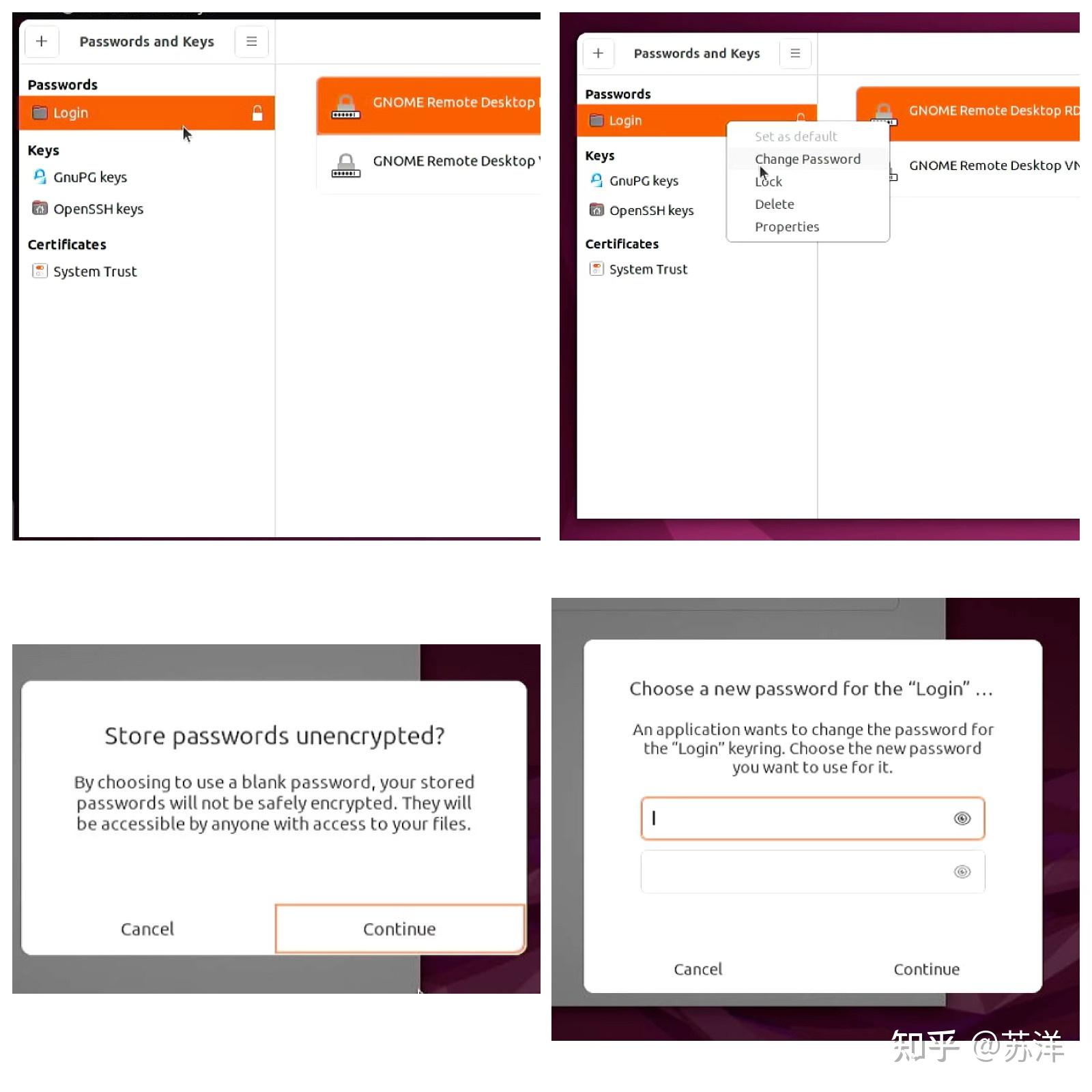 好啦,聊完使用部分,本篇文章就讲完一半啦。 如果你对原理和踩坑部分感兴趣,可以继续阅读,如果你只是想解决问题,上面的文章内容,应该能够帮到你了。别忘记给软件“一键三连”~ 聊聊原理虽然,在上面的文章里,我们轻描淡写的就解决了问题。 但其实,软件想要稳当的运行,提供功能,需要解决不少细碎的问题。 实现自动更新系统配置的原理软件提供的主要功能之一,是自动对系统远程控制相关功能进行配置,并保证配置内容是“稳定的”。 如果不使用程序,我们可以通过系统提供的 比如,先使用 org.gnome.desktop.remote-desktop org.gnome.desktop.remote-desktop.rdp org.gnome.desktop.remote-desktop.vnc 然后,使用 enable screen-share-mode tls-cert tls-key view-only 接着,使用 true 以及,我们可以通过使用 将上面的操作使用程序来实现,就完成了配置的基础自动化。 远程登录凭证(用户名和密码)的修改原理虽然用于“远程控制”的用户名和密码也属于配置,但是配置的麻烦程度远超上面提到的系统配置。 Ubuntu 中的远程登录凭证保存在系统的 Keyring 中,想要使用程序的方式去操作它,我们需要先安装一个依赖工具 完成工具安装之后,我们就可以使用命令 {'username': <'soulteary'>, 'password': <'&@RhOxaBakTe'>} 日志输出中的 如果我们希望完成登录凭证的调整,可以通过执行 不过,这种方式将会触发交互式的操作确认,比较不利于实现程序完成操作。 所以,我们可以借助下面的命令,通过管道的方式,自动完成交互式的输入。 printf "{'username': <'soulteary'>, 'password': <'soulteary'>}" | secret-tool store -l 'GNOME Remote Desktop RDP credentials' xdg:schema org.gnome.RemoteDesktop.RdpCredentials完成设置之后,就可以使用 {'username': <'soulteary'>, 'password': <'soulteary'>} 当然,上面这两条命令,如果是在“系统未开启自动登录”、“用户停留在锁屏界面”、“系统默认使用的加密 Keyring”、“使用后台程序启动的 Urch” 几类场景下,是都无法简单执行成功的。 所以,还需要解决上面提到的几个问题。 为什么要开启系统自动登录尤其是 Desktop 版本的 Ubuntu 操作系统,如果我们不开启“用户自动登录”,则会遇到两个问题。 第一个问题是“原生的远程出桌面”功能不会伴随系统启动。Ubuntu Remote Desktop 功能,只有在用户首次登录解除屏幕锁定之后,才会真的启动,本质是调用 ... /usr/libexec/gnome-remote-desktop-daemon 第二个问题是,在我们没有调整 Keyring 权限之前,是无法通过程序自动的更新用户登录凭据的。 举个例子,如果你直接使用 secret-tool: Cannot create an item in a locked collection 想要解决上面这两个问题,我们只需要进入系统,在系统设置中选择我们的用户,然后设置用户为“自动登录”即可。 Ubuntu 桌面版和我们的手机系统一样,会自动开启桌面锁定。但是系统锁定后,也是会影响 Urch 保障系统配置为正常值的设置。 除了在系统设置界面中关闭界面锁定之外,我们还可以执行下面的命令,来解决这个问题。 gsettings set 'org.gnome.desktop.session' 'idle-delay' 0当然,你不执行也无所谓,Urch 会检测这个配置,并自动关闭这个功能,避免运行环境不靠谱。 解决系统会弹出认证登录框的问题当我们使用编程方式(调用 API)来设置系统登录凭证的时候,可能会遇到动作被“卡住”的情况。此时,系统会弹出一个“认证登录”的确认窗口,需要我们输入密码,点击确认按钮,然后才能完成操作。 ![]() 系统弹出的强制认证对话框 但是如果程序是无人值守状态,即没有用户登录在系统上时,遇到了这个问题,那么程序就无法保障我们的配置都是正常的啦。 想要彻底解决这个问题,最简单的方案是登录系统,搜索 “keyring”,打开系统密钥管理应用。 ![]() 打开系统的 Keyring 管理应用 接着,找到包含 Remote Desktop 相关的记录,然后在左侧的菜单上右键,选择“修改密码”,输入当前密码点击确认之后,系统会要求我们输入新密码以及对密码进行二次确认,这里我们不输入任何内容,会看到系统提示我们这样做将会“解密存储的密码”,点击确认即可。 ![]() 取消对远程登录相关信息的加密存储 完成操作后,我们重启系统。 再次进入系统之后,我们再次执行刚刚的命令,会发现不会再出现“系统弹窗认证”的问题啦。 printf "{'username': <'soulteary'>, 'password': <'soulteary'>}" | secret-tool store -l 'GNOME Remote Desktop RDP credentials' xdg:schema org.gnome.RemoteDesktop.RdpCredentials无外接显示器登录原理当我们没有给 Ubuntu Desktop 安装显示器的时候,如果我们想用 RDP 软件来连接系统,进行 GUI 登录,会得到类似 “The disconnection was initiated by an administrative tool on the server in another session”的错误。 当然,默认情况不论是 RDP 还是市面上的三方商业远程控制软件都是如此。 解决这个问题的最佳方案是安装“虚拟桌面”: sudo apt-get install -y xserver-xorg-core xserver-xorg-video-dummy完成依赖安装之后,我们对 Identifier "Configured Video Device" Driver "dummy" EndSection Section "Monitor" Identifier "Configured Monitor" HorizSync 31.5-48.5 VertRefresh 50-70 EndSection Section "Screen" Identifier "Default Screen" Monitor "Configured Monitor" Device "Configured Video Device" DefaultDepth 24 SubSection "Display" Depth 24 Modes "1920x1080" EndSubSection EndSection 将上面内容保存在 最后本篇文章目前提到了,如何让 Ubuntu 原生的远程控制稳定可靠,下一篇相关的内容里,我们来聊聊细粒度的控制,以及让这个远程管理会话安全可靠。 自从能够