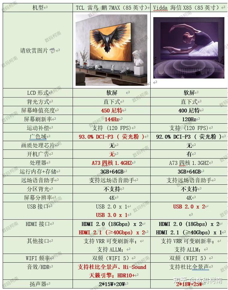 这题我会,按照买新不买旧的原则,买雷鸟新品电视鹏 7Max 。 TCL雷鸟电视是TCL旗下的互联网电视子品牌。 即使不按照买新不买旧的原则,那也是雷鸟新品电视鹏 7Max值得入手,价格虽然贵了近300元,但是其拥有全新的MT9653处理器,这种处理器相对比上一代处理器,主要是增加了接口数量,MT9653处理器能够支持2个HDMI2.0接口和2个HDMI2.1接口,如果平时有需要用到HDMI2.1接口的时候,也不用担心不够用的问题了。 整体的配置更强,系统也更流畅,取得了莱茵低蓝光和低频闪认证,更加护眼,一如既往的没有开机广告! 最主要雷鸟鹏 7Max 的9653机芯这个最新CPU加分,144Hz真高刷配上2个HDMI2.1满血版接口,即使玩游戏也会非常舒服。 Vidda在价格方面要更便宜一些,实际上这个vidda电视是海信旗下的品牌,主打中低端入门电视市场,在价格上自然就要比海信便宜。 雷鸟新品电视鹏 7MAX(85英寸)Vidda 海信电视X85(85英寸)而且Vidda电视与海信电视为海信旗下不同电视产品线,Vidda电视主要面向年轻消费群体,并采用线上销售的渠道,与海信电视相比有着免去线下店铺运营的成本优势,因此也能做到更多的让利于用户。 但是这款Vidda 海信电视X85上市时间比较早,大概在在2021年9月份 ,虽然价格便宜,但是很多配置比较老旧,是不如雷鸟新品电视鹏 7MAX的。 这款雷鸟鹏7 MAX,虽然是新上市的,但是价格也没有说贵太多,也就贵了300元,所以这个价格就非常有优势,在这个价位区间目前非常值得入手。 当然也不是说海信vidda x85游戏电视不好,这款电视机的优点是性价比还是比较不错的,然后有4k分辨率和129hz刷新率画质以及配有hdmi2.1接口,作为一款家用电视和游戏电视都行,海信vidda x85游戏电视的缺点是存储小了一些,能装的东西少。 还有就是为什么电子产品买新不买旧呢? 因为电子产品更新换代速度非常快,新产品的性能要比旧的产品高很多,而且一般来讲旧产品价格也往往不占优势,最重要的一点是旧产品的配件往往不如新产品容易购买,一旦出现问题,会造成维修困难,所以电子产品买新不买旧。 下面给大家放张图,看下两款电视机的配置对比,方便大家选购: ![]() 通过以上配置表,大家不难发现,在价格差不多的情况下,雷鸟新品电视鹏 7MAX在配置方面是要优于海信vidda x85的。 Vidda 海信X85采用全金属悬浮全面屏外观,配备了25W功率独立低音炮,无论是观影还是游戏,都能拥有更震撼的临场感。且Vidda 海信X85搭载的MEMC动态补偿技术也升级至120Hz,支持130% REC BT.709广色域。 ![]() 游戏连接上,Vidda 海信X85配备的HDMI 2.1接口不仅可以实现4K/120Hz显示,还支持了VRR可变刷新率技术,避免游戏画面撕裂,还支持ALLM自动低延迟技术,Vidda 海信X85堪称新一代游戏主机的绝配。Vidda 海信X85还与腾讯Start云游戏建立深度合作,可以直接在大屏上流畅低延迟地畅玩最流行的电脑游戏大作。 Vidda 海信X85沿袭了Vidda重视音乐体验的基因,支持杜比ATOMS和蝰蛇音效,而且内置了专属音乐频道和K歌频道,内含酷狗千万级海量音乐资源,配备海信麦克风,直接可以化身家庭KTV。 在硬件配置方面,Vidda 海信X85配置了旗舰级的4×A73智能芯片,拥有的3+64GB运行存储,足够支撑系统长久稳定运行。网络连接方面,Vidda 海信X85配备双频双通道无线网卡,支持蓝牙5.0,还支持远场语音控制,NFC投屏等。 ![]() 雷鸟新品电视鹏 7MAX则是采用了非常简约的设计,整个电视机身非常纤薄,厚度只有约10mm左右,有着非常出色的视觉效果,而且整个液晶屏幕也非常大足以满足用户对于大屏幕电视的需求。电视的整体框架采用了金属材质,非常坚固耐用,左右两侧也没有任何边框,在观影的时候不会有太多的干扰,还能带来更加宽广的视野体验。 雷鸟鹏7 MAX电视的内存为64GB+3GB,四核A73的CPU内核,1个USB2.0和1个USB3.0、1个HDMI2.0和1个HDMI2.1接口配置,在内存和CPU上配置还是很给力的。同时也采用了新的解码芯片:Pentonic 700芯片,在整体的解码能力上表现还是非常不错的。 搭载了联发科开发的mtk9653SOC芯片,具备非常强大的运算能力,可以带来非常流畅的游戏画面表现,而且支持144Hz的高刷率和HDMI2.1接口,可以支持更高的分辨率和更高的帧率,游戏图像更加细腻丰富,同时还内置了3+64GB大存储,这样的话就可以安装更多的软件。 雷鸟虽然是互联网品牌,但是在画质调教上确实比传统厂商有优势,当然在画质上也是比Vidda 海信X85更有优势,相信大家在上面的配置表中可以非常明显的看出来。 ![]() 在广告方面,雷鸟是没有开机广告的,而Vidda 海信X85则有广告,这点雷鸟就比Vidda 海信X85强不少。 包括接口、音响音效、屏幕峰值亮度、屏幕刷新率、处理器等,都是雷鸟比Vidda 海信X85强,这点是毋容置疑的。 总体来看,如果要我选的话,我肯是的选择雷鸟鹏7 MAX,不仅仅因为其是新款,在整体的配置和游戏体验方面都要更占优势,而且价格也没有很贵,妥妥的性价比神机,而Vidda 海信X85在价钱和雷鸟差不多的情况下,价钱却没有任何亮点,不是特别推荐。 其实无论选择哪款,我希望大家都要根据自己的实际预算和需求来进行选择,切记不要盲目购买,毕竟是个大物件! 好啦,以上就是本期的全部内容了~ |