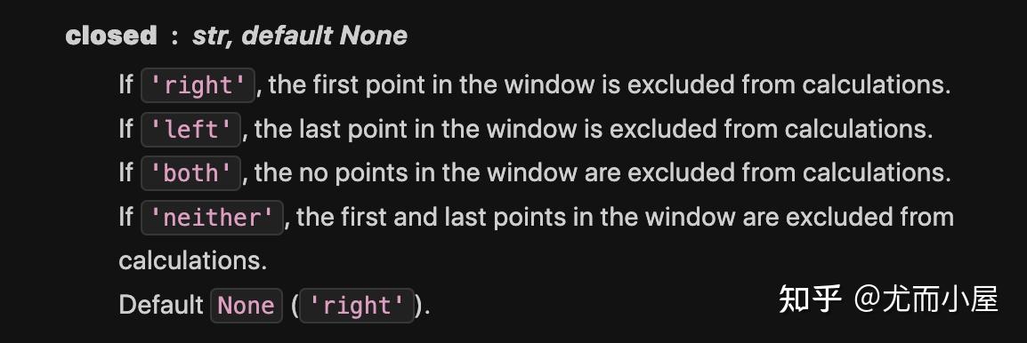取值4:neither如果直接使用neither,结果全部为NaN: ![]() 解决bug:可以参考pandas官网的issue:https://github.com/pandas-dev/pandas/issues/39038 ![]() 当close='neither'时,参数min_periods不等于n-1(n为窗口大小),而是等于n。 作为滚动计算的对象窗口里,却至多只剩n-1个值,达不到min_periods的最小窗口值 数(n)的要求。所以我们需要手动将min_periods设置成: n-1 ![]() 具体的解释参考下面的图示: