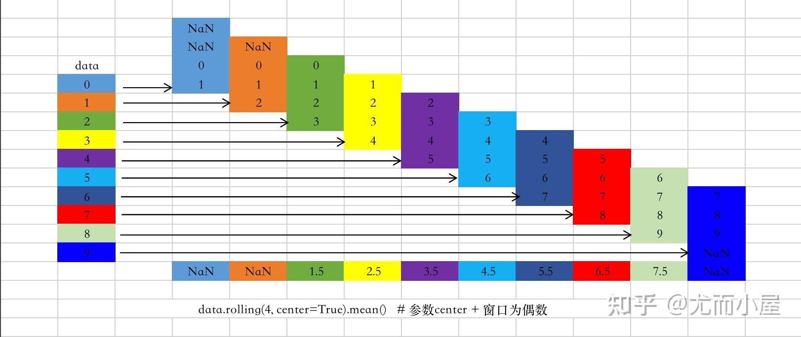 注意:当min_periods的值大于窗口window的值时,则会报错: ![]() 参数center如何理解参数center?表示的是以当前元素为中心,在上下两个方向进行滑窗然后进行统计计算: In [11]: data.rolling(3, center=True).mean() # 参数center + 窗口为奇数具体的过程可以看下面的图解: