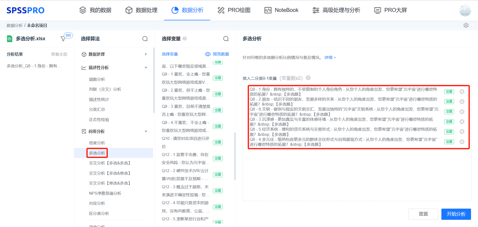 案例:试分析用户对“元宇宙”未来拓展方向的喜好呈现的比例是否有差异性 软件操作: ![]() step1:打开SPSSPRO免费数据分析网站,选择[多选分析] step2:拖入多选题 step3:点击【开始分析】进入分析,系统自动分析结果 输出结果分析 ![]() 多重响应频率分析表显示,从您个人的角度出发,您更希望“元宇宙”进行哪些特质的拓展? 【多选题】的卡方拟合优度检验的显著性P值为0.000***,水平上呈现显著性,拒绝原假设,意味着各项的选择比例比较呈现显著性差异,分布不均匀。 ![]() 图表说明:帕累托图是“二八原则”的图形化体现,80%的问题是由20%的原因所致。 第一:结合图形,找出累计比率为0%~80%对应的选项(“至关重要项”),并且结合实际业务知识详细分析该类项。 第二:累计比率在80%~100%对应的选项,其为“微不足道项”,此类项重要性较低。 2、交叉分析2.1 交叉分析【多选&多选】 分析每一个多选题在每一个多选题项选的分布与差异情况。 分析步骤: