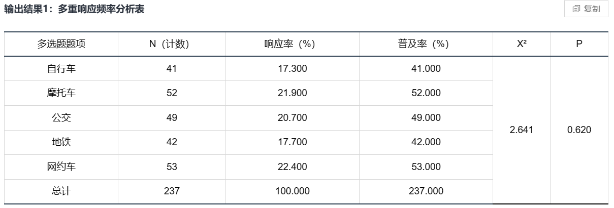 在问卷设计中,为了更全面地了解研究内容和研究对象,常常会使用多选题。 然而,许多人只是简单地使用频数分析来处理多选题数据,而忽略了许多有价值的信息。 实际上,还有很多的多选题分析方法可以用来深入了解受访者的选择行为和偏好。本文将介绍几种常用的多选题分析方法,以帮助更好地利用多选题数据,挖掘出更丰富的信息。 一、多选题录入在处理多选题时,将每个选项都处理成二分类定类变量是一种常见的做法。 可以将每个选项都看作一个变量,然后将其定义为二分类变量,其中1表示选择该选项,0表示未选择该选项。 需要注意的是,二分类变量的取值必须严格的为0、1,其中1表示选中,0表示未选中。如果使用其他取值,比如2或3来表示选中,可能会导致数据分析和统计结果出现错误。 示例: ![]() 二、多选题分析1、多重响应频率分析多重响应频率分析是针对问卷调研设计的一种分析多选题的比例情况和普及情况的模型。 通过多重响应频率分析,我们可以计算每个选项被选择的频数或占比,以及不同选项之间的组合频数或占比,进而了解不同选项之间的差异性和相关性。 多重响应频率分析步骤: