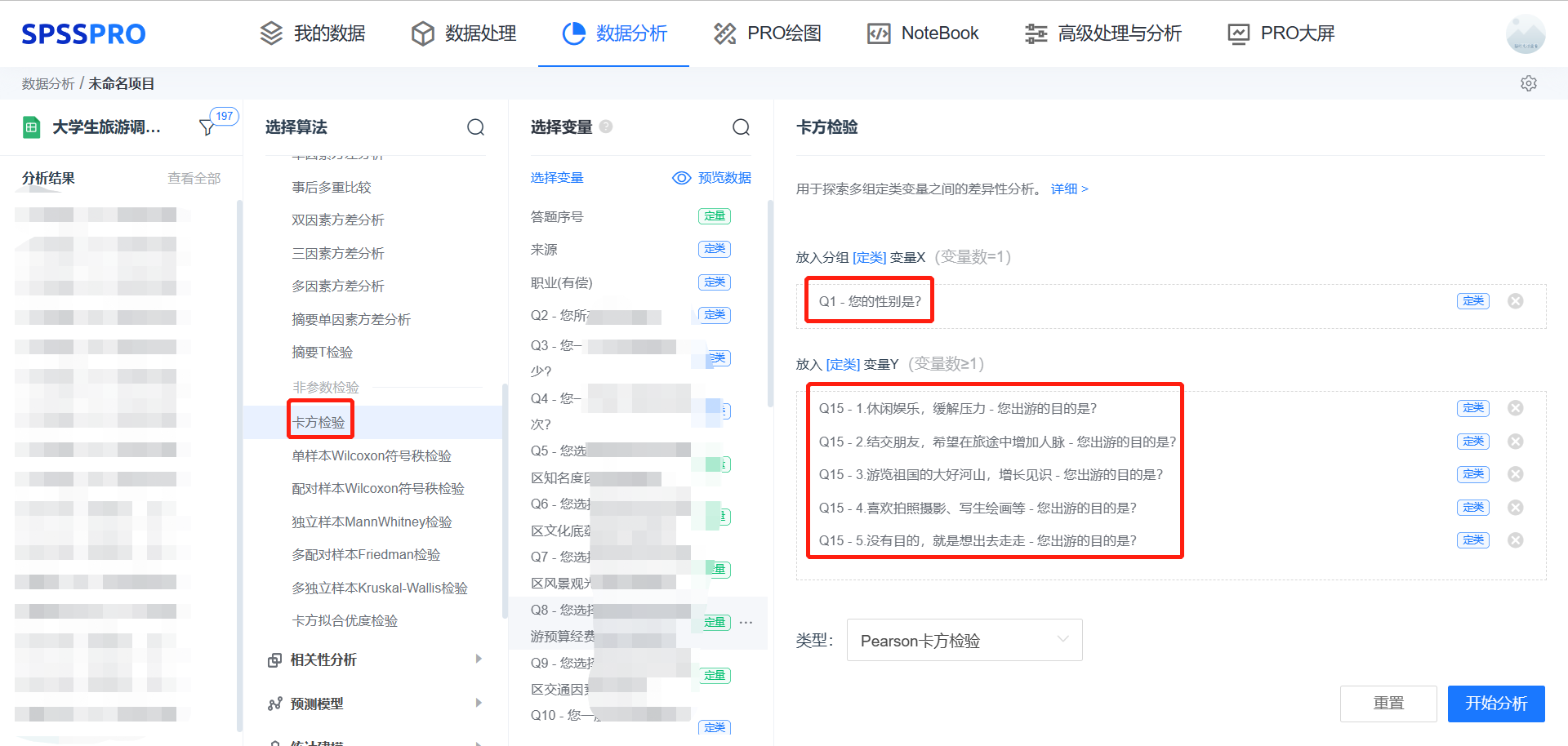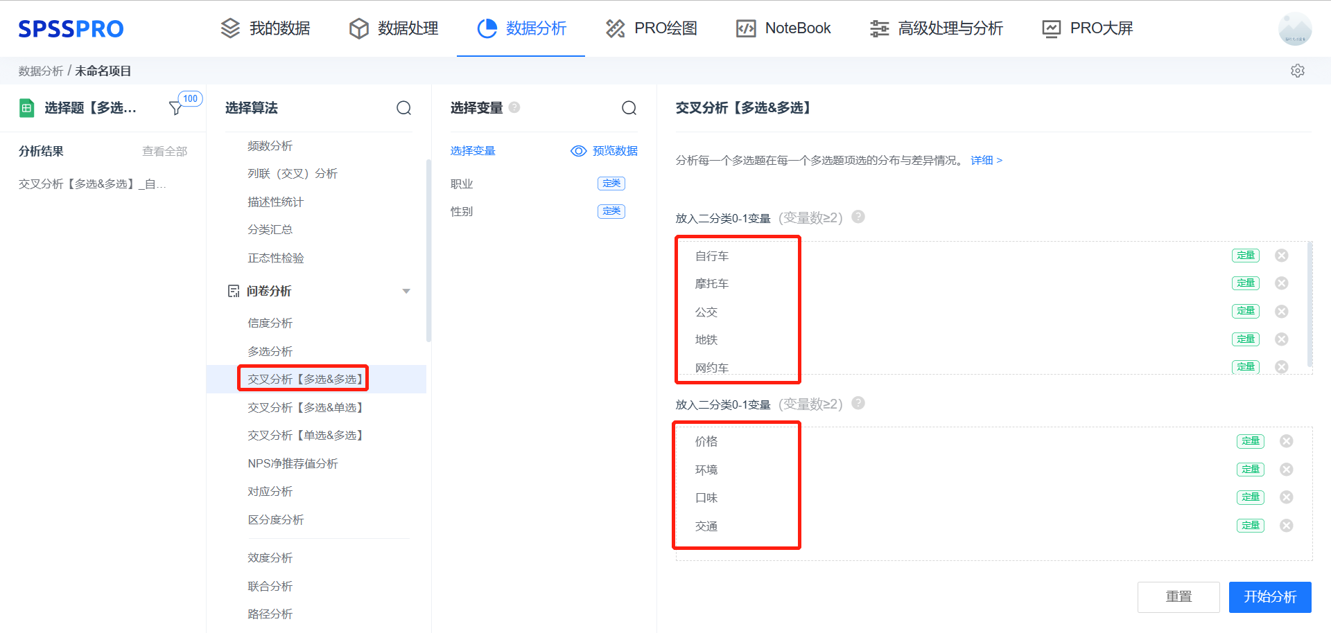 案例:“影响购物的因素”这个多选题与“您平时出行的交通工具”这个多选题,分析各种交通工具的用户对于选择购物的差异性。 软件操作: ![]() step1:打开SPSSPRO免费数据分析网站,选择交叉分析【多选&多选】 step2:输入多选题,选项至少两项或以上的二分类定类变量,需要注意的是,这里的二分类只能是0或1,并且1代表选中。 step3:点击【开始分析】进入分析,系统自动分析结果 输出结果分析: ![]() 根据的多重响应频率分析表显示,分析项:自行车、摩托车、公交、地铁、网约车的卡方拟合优度检验的显著性P值为0.620,P值大于0.05,水平上不呈现显著性,接受原假设,意味着各项的选择比例比较均匀,没有显著性差异。 2.2 交叉分析【多选&单选】 分析每一个多选题的题项在每一个单选题项的分布与差异情况。 案例:“您日常出行的交通工具是什么”这个多选题与“您的职业”这个单选题,分析日常出行的交通工具偏向用户的职业差异性。 输入:多选题选项至少两项或以上的二分类定类变量,需要注意的是,这里的二分类只能是0,1,并且1代表选中,单选题为一个或一个以上的定类变量。 输出:以多选题各个选项作为分组,对单选题的选型分布情况进行交叉列联分析。 2.3 交叉分析【单选&多选】 分析单选题在每一个多选题题项选择的分布与差异情况。 输入:单选题为一个或一个以上的定类变量;多选题选项至少两项或以上的二分类定类变量,需要注意的是,这里的二分类只能是 0,1,并且 1 代 表选中。 输出:以单选题作为分组,对各个多选题选项的分布情况进行交叉列联分析。 案例:“您的性别”这个单选题与“您日常出行的交通工具是什么”这个多选题,分析不同性别选择偏向的的交通工具。 3、卡方检验卡方检验主要是比较定类变量与定类变量之间的差异性分析。通过统计样本的实际观测值与理论推断值之间的偏离程度,实际观测值与理论推断值之间的偏离程度就决定卡方值的大小,如果卡方值越大,二者偏差程度越大;反之,二者偏差越小;若两个值完全相等时,卡方值就为 0,表明理论值完全符合。 输入:一个定类变量 X(如学校字段,包括甲学校、乙学校)与定类字段 Y(如甲学校 40 名学生与乙学校 60 名学生的体育成绩等级) 输出:模型检验的结果,如甲学校与乙学校的学生体育成绩等级存在/不存在显著性差异 软件操作: ![]() step1:打开SPSSPRO免费数据分析网站,选择【卡方检验】 step2:拖入变量 step3:点击【开始分析】进入分析,系统自动分析结果 示例:看不同性别和旅游出行的主要开销之间是否存在差异。 输出结果分析: ![]() 卡方检验结果显示:Q1 - 您的性别是?和Q14 - 2.住宿 - 您出行的主要开销是?pearson卡方检验的P值为0.033**,数据存在显著性差异。 4、对应分析对应分析,又称为R-Q型因子分析,适用于有多个类别的分类变量,可以揭示同一个变量各个类别之间的差异,以及不同变量各个类别之间的对应关系,与卡方检验不同的是,对应分析不单单展示了不同分组的差异性,也能通过2维、3维的方式展示其在空间的关系。 输入:至少两项或以上的定类变量。 输出:两个定类变量里面不同分组的空间关系与差异性。 对应分析可以将多个分类变量映射到一个低维空间中,以便于分析它们之间的关系。 案例:比如分析1992年美国大选中,不同教育程度选民的选举倾向性有何特点,例如高中生、学士更倾向选老布什还是克林顿,克林顿主要依靠哪个群体的力量打败了老布什和佩罗等。 ![]() 注意事项: 1、多选题一般一个选项是单独的一个变量,比如 5 个选项就有 5 个变量,同时数据输入格式要求只能是 0,1,并且 1 代表选中 2、对应分析的前提条件是两两定类数据之间具有相关关系,可以通过 SPSSPRO-Kappa 进行相关性分析 3、采用对应分析时,要注意修正一下列名与数值标签,避免太长文字导致因子载荷分布图不美观 相关推荐 |