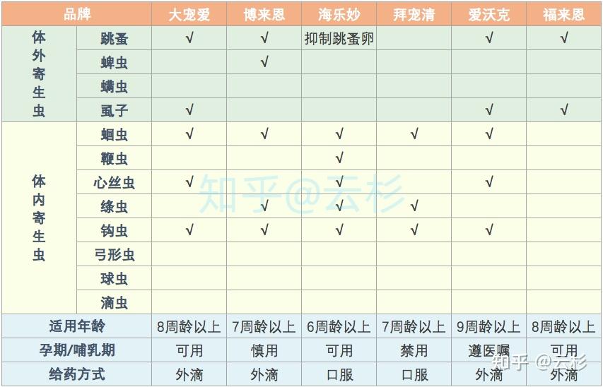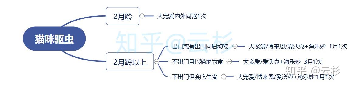 驱虫家猫可能从食物、水源、环境中接触寄生虫,并将丝虫、绦虫、线虫等通过各种途径传染给人类[84][85][86][87]。 规律驱虫是预防人与猫寄生虫病的有效手段[88][89],是养猫的刚性支出,较为成熟的驱虫药及方案如下: ![]() 常见驱虫药覆盖虫谱: ![]() 大宠爱、博来恩等驱虫药物使用简便,扒开后颈毛多点滴入即可。 海乐妙等内外同驱为内服药物,饲喂相对麻烦,但虫谱覆盖更广。 注意: