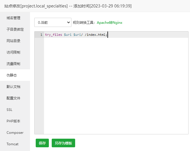 3.3配置伪静态 最重要的一点来了,由于我的项目采用的History模式而非Hash,由于History模式下我们没有配置好路由,导致web服务器找不到我们的入口,直接部署完前端静态文件后会使直接访问url时404报错,这是我们需要在Nginx的伪静态中新增重写规则来完成路由指向: