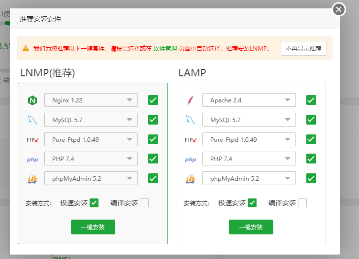 安装完成后首先安装服务器套件,本文使用Nginx1.22、Mysql5.7,各位可以根据实际需求选择安装: