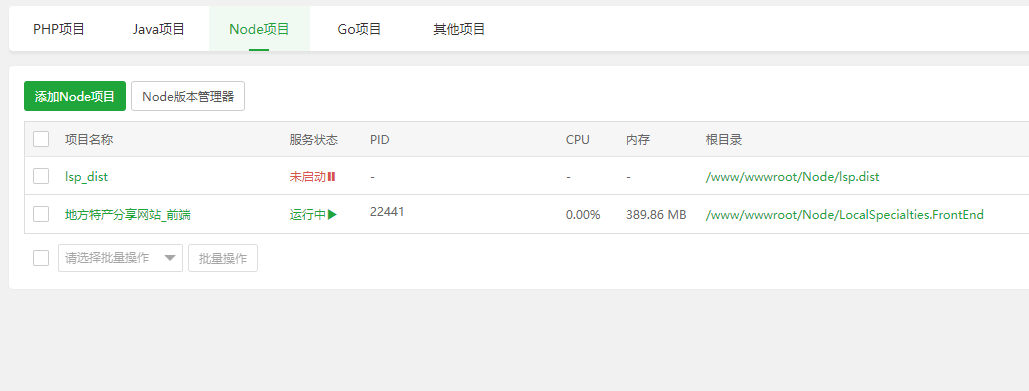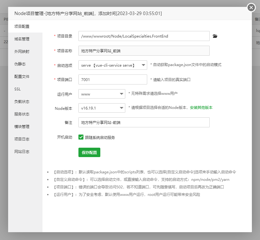 3. 部署项目 3.1上传并配置Vue项目 接下来我们上传Vue项目到服务器上并完成基本配置后点击保存即可,其中启动选项我们选择了npm run serve来完成对项目的测试: