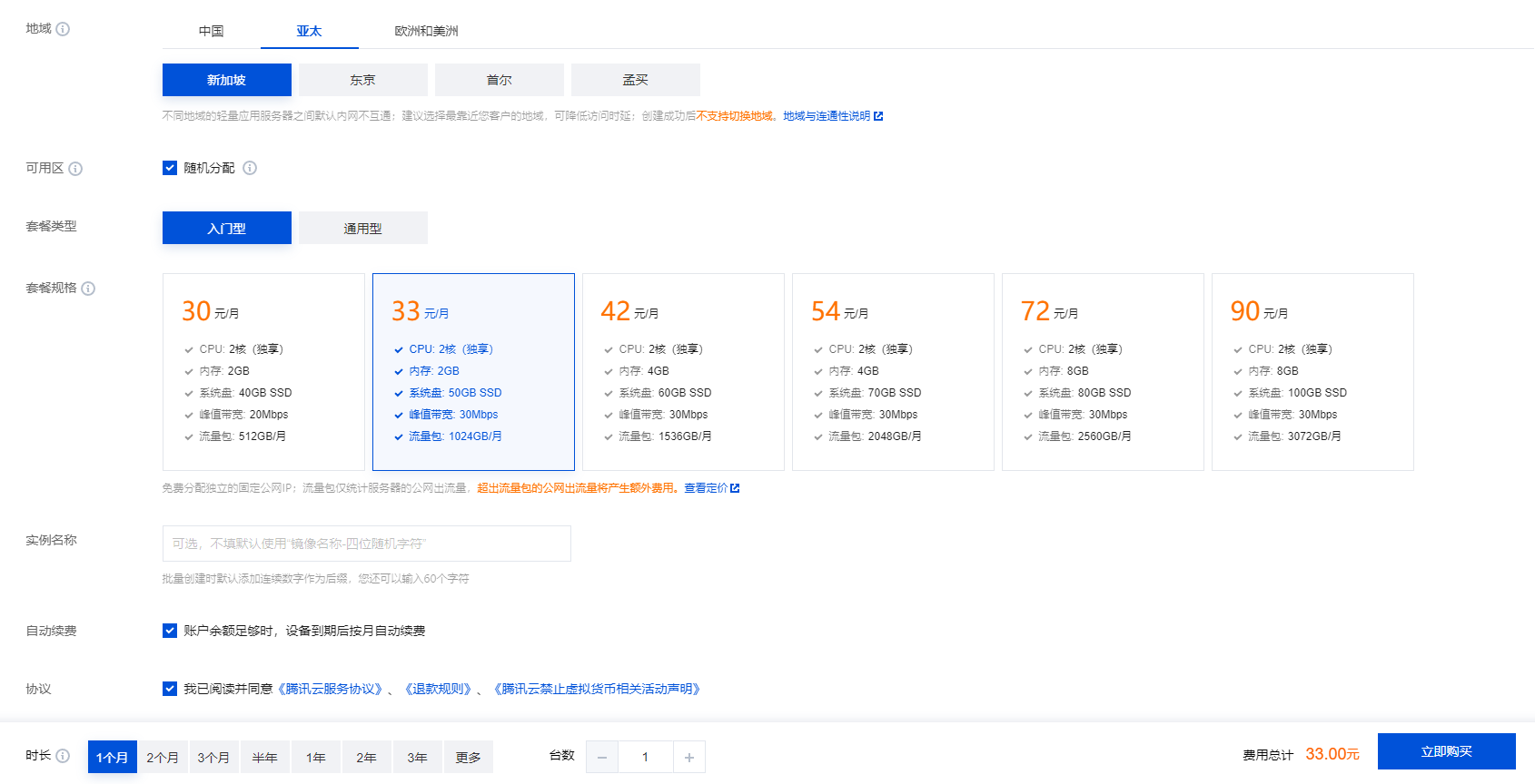 教程 1.配置服务器 1.1购买服务器 最近腾讯云新上架了一批轻量应用服务器,为您提供多款型号选择,以实惠的价格为您提供稳定、高效的运行环境,本文我们选用33元/月的配置来完成教程。