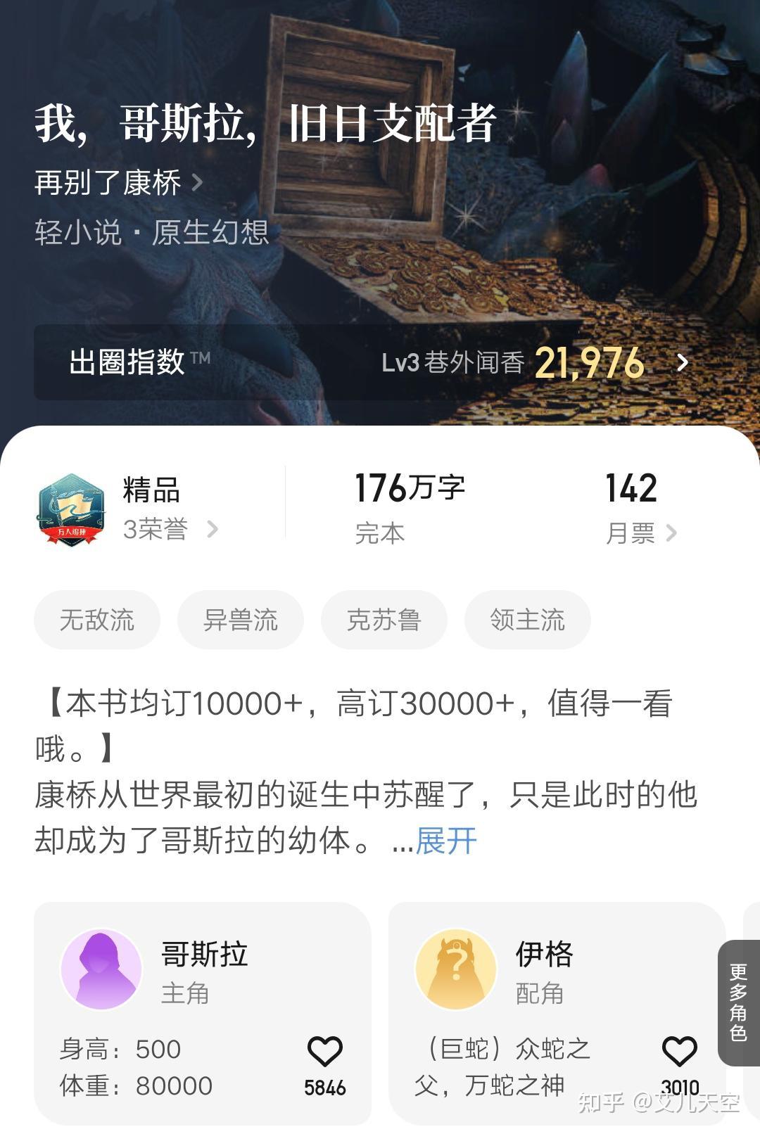 小说属于异兽流题材,去年5月10号上线,到今年4月11号完结,算是正好11个月,总字数176万,看着还行。 小说在成绩方面属于低开高走,但后期作者有点摆烂,更新不稳定,小说成绩就不升反降了。 去年六月上架时首订三千多,用了两个多月突破万订,而如今完结看着就只有八千以上的成绩了,下滑还是很明显。 前期提升快跟作者写作有激情,常常日更过万有关,后期的话不知道算不算是剧情不好编排以至于收尾难,更新断断续续,就让很多人不看了。 小说里主角穿越到一个末日爆发一样的荒芜世界,开局成为了一只蜥蜴,不惧水火,各种极端环境都能生存,就是时不时需要沉睡。 而经过沉睡蜕皮,再醒来时他发现自己成了一只哥斯拉,各种巨兽生物也慢慢演化了出来。而在他的影响下,一群恐龙一样的巨兽更是进化成了恐龙人,并且奉其为神明,与此同时这个世界也有了其他异类神明。 不过主角这头哥斯拉实力爆表,什么神明巨兽都不是其对手,打各种奇奇怪怪的克苏鲁风格的诡异生物也是丝毫不虚。 小说后面主角更是攻略了很多西方神话里的神明,本身还是属于西幻文类型。 当然我看得有限,主要还是看了前期的内容,西方神话并不是很感兴趣。 其实这类作品感觉比较适合写成创世文的风格,去推动各种文明的形成发展。 总之小说已经完结,有兴趣的可以去看看,另外作者在完结感言里,提到了他以前的作品《我能够化身万物》,我这才知道他之前的笔名是谁。