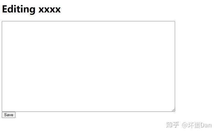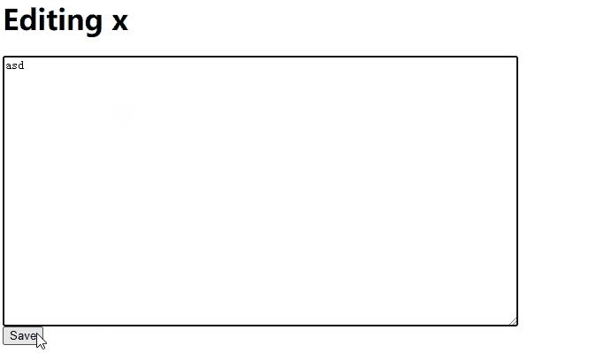 然后浏览器/ ![]() img_access_testPage 正常 编辑页面现在我们基本打通访问的流程了,那么就可以接收输入了。 func editHandler(w http.ResponseWriter, r *http.Request) {title := r.URL.Path[len("/edit/"):] p, err := loadPage(title) if err != nil { p = &Page{Title: title} } fmt.Fprintf(w, "<h1>Editing %s</h1>"+ "<form action=\"/save/%s\" method=\"POST\">"+ "<textarea name=\"body\">%s</textarea><br>"+ "<input type=\"submit\" value=\"Save\">"+ "</form>", p.Title, p.Title, p.Body) } func main() { http.HandleFunc("/view/", viewHandler) http.HandleFunc("/edit/", editHandler) log.Fatal(http.ListenAndServe(":8080", nil)) } 提供一个 我们再来实现这一部分 func saveHandler(w http.ResponseWriter, r *http.Request) {title := r.URL.Path[len("/save/"):] body := r.FormValue("body") p := &Page{Title: title, Body: []byte(body)} err := p.save() if err != nil { fmt.Fprintf(w, "save error: %s", err) return } fmt.Fprintf(w, "save success") } func main() { http.HandleFunc("/view/", viewHandler) http.HandleFunc("/edit/", editHandler) http.HandleFunc("/save/", saveHandler) log.Fatal(http.ListenAndServe(":8080", nil)) }