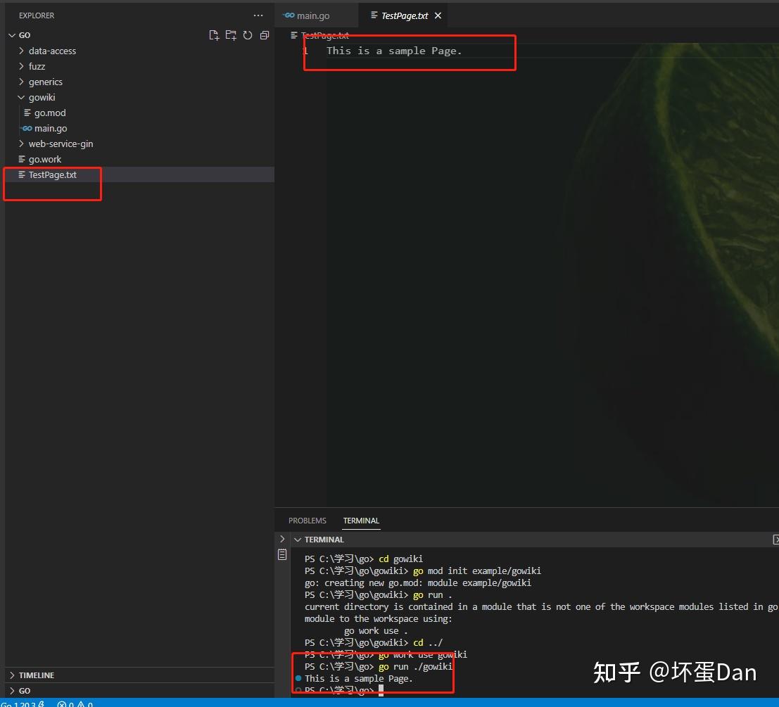 这个方法是用来将当前的内容写入 这里就回到了我们前面留的问题: 因为这里要调用 既然有 filename := title + ".txt" body, err := os.ReadFile(filename) if err != nil { return nil, err } return &Page{Title: title, Body: body}, nil } 这里的写法 而 扯远了。。。回到我们的代码中,我们来试下这两个方法是否正常 func main() {p1 := &Page{Title: "TestPage", Body: []byte("This is a sample Page.")} p1.save() p2, _ := loadPage("TestPage") fmt.Println(string(p2.Body)) } 然后我们运行下 ![]() img_save_and_load_Page_success 正常 net/http[1]我们前面简单的接触过 我们先来看下基础用法 //go:build ignorepackage main import ( "fmt" "log" "net/http" ) func handler(w http.ResponseWriter, r *http.Request) { fmt.Fprintf(w, "Hi there, I love %s!", r.URL.Path[1:]) } func main() { http.HandleFunc("/", handler) log.Fatal(http.ListenAndServe(":8080", nil)) }