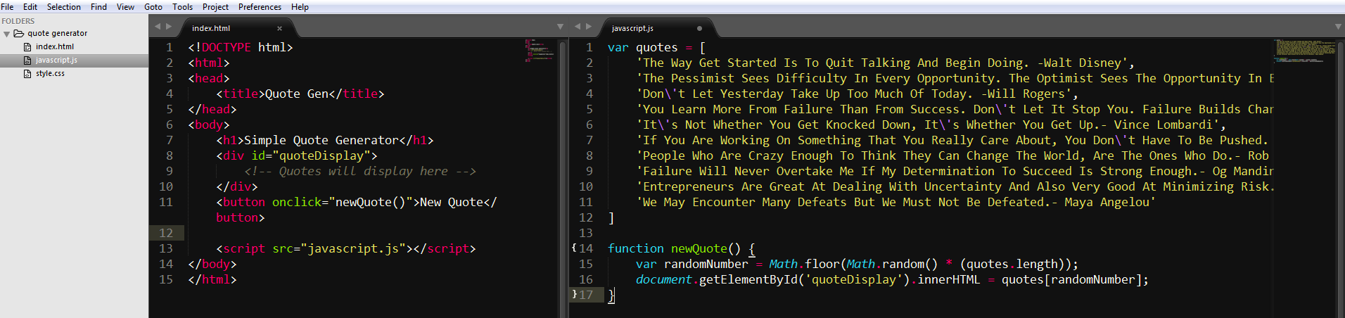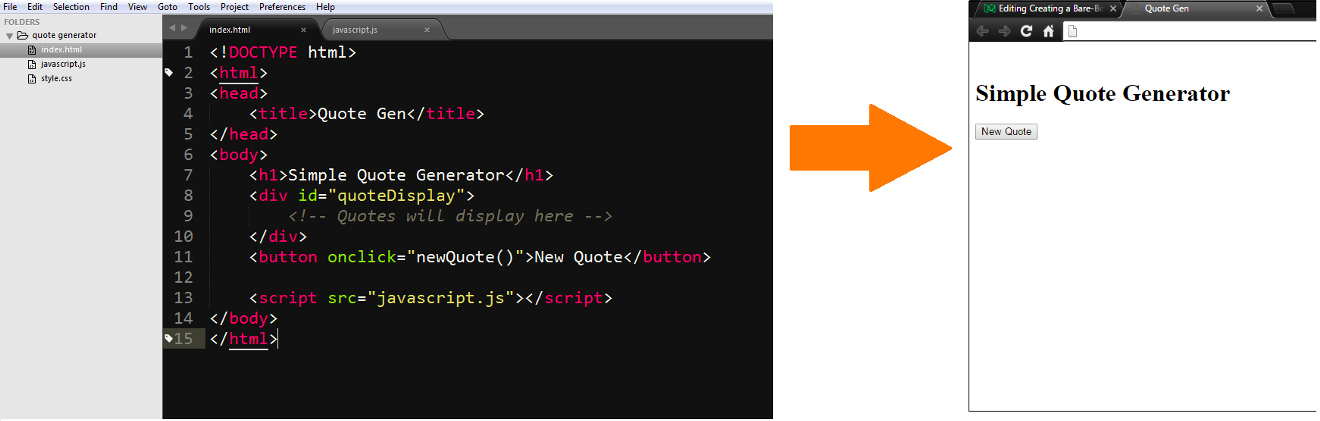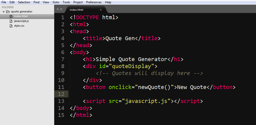 - 文本编辑器 - 开发 Web 应用的热情 在这篇文章中,我会使用谷歌的 Chrome 浏览器、Sublime Text 3 编辑器,以及我对编程和传授编程技巧的热情。关于浏览器和编辑器,你喜欢哪个就用哪个,不一定和我使用一样的工具。 我们开始吧第一步,创建一个文件夹,我们将会把所有文件都放在这个文件夹内。在桌面上创建一个新文件夹,将其命名为“名言生成器”。打开 Sublime Text,将文件夹拖进去。现在你应该可以在侧边栏看到这个文件夹了。 ![]() ![]() 大多数 Web 项目都由至少一个 HTML、JavaScript 和 CSS 文件组成。我们现在在这个文件夹内创建这些文件。 在 Sublime Text 中,右键点击“名言生成器”文件夹,然后单击创建新文件。之后底部会弹出一个输入栏,你需要在这里对文件进行命名。输入 “index.html” 然后回车,这样你就创建好了 index.html 文件。继续重复这一步两次,创建 javascript.js和 style.css 文件。需要注意的是,在给文件命名的时候,一定要全部使用小写字母。 ![]() 在创建完文件之后,我先来写 HTML,它将会是整个项目的基石。先来准备 HTML 文档的基本框架。下图就是还没有写内容的 HTML 文档,你可以把它想象成 HTML 文档的骨架,之后我们将会一点点地丰富它。 ![]() 现在我们来将 JavaScript 和 HTML 文档进行连接,这样 JavaScript 代码就能够配合 HTML 一起工作了。我们还需要在 <title> 标签内添加文本,例如 <h1> 元素、带有 “quoteDisplay” 这个 id 的 <div> 元素,还有一个 <button> 元素,其 onclick 属性应该为 “newQuote()”。 ![]() 详细讲解如果上图中的 HTML 让你有点迷惑,不知道每一行代码起到的都是什么作用,那我就在这里给你详细讲解。如果你已经学过基本的 HTML,那么这一部分你可以直接跳过。 首先,我们在 <title> 标签内添加了 “Quote Gen”,这个标签会读取内部的文本,然后将其显示在浏览器的标签上,请看下图: ![]() 在这一步中,我们还让 HTML 文档连接了 javascript.js 这个文件,方法就是在 <body> 标签结束之前添加了一个 <script> 标签: ![]() 其次,我们还创建了一个 <h1> 标签,里面写的内容为 “Simple Quote Generator”。这个文本将会显示在页面上: ![]() 之后,我们还创建了一个 <div> 元素,并且给其指定了一个名为 “quoteDisplay” 的 id。<div> 元素的作用是区分 HTML 文档的各个部分,它可以帮助我们组织页面上内容的结构。 id 属性是扮演识别符的角色,让 JavaScript 能够轻松找到它,并且对其进行操作。在这个例子中,我们要使用 JavaScript 获取带有 “quoteDisplay” 这个 id 的元素,然后将名言放在 <div> 元素中。 ![]() 之后,我们还需要创建一个 <button> 元素,并且给其定义一个名为 “newQuote()” 的 onclick 属性。<button> 元素,顾名思义,就是创建一个按钮,让用户去点击。onclick 属性,就是用来设定按钮的函数的,也就是按钮的功能:你点击这个按钮之后,会出现什么效果。 在这个例子中,你每一次点击这个按钮,它就会运行 newQuote() 函数。不过我们现在还没有定义 newQuote() 函数。如果你现在在浏览器中点击这个按钮,它会发回一个错误提示,因为这个函数还不存在。<button> 元素所创建的按钮效果如下图: ![]() 最后我们来看一下整体效果,左边是代码,右边是浏览器中的样子: ![]() 思考逻辑终于要开始写 JavaScript 代码了,在写好 JavaScript 代码之后,这个名言生成器就能正常工作了。 但是在开始写代码之前,我们要先仔细构思一下。没有良好的计划,你是无法写出优秀的代码的。 首先,我们要确定自己想要什么,以及何时需要它。对于这个项目来说,我们需要的就是名言。何时需要它?就是用户每一次点击按钮之后。 现在我们已经解决了第一个问题。还有一个问题:名言是什么?我当然知道它是名人说过的话,我的意思是,站在技术角度上看,它是什么东西? 名言其实就是字符串! 名言就是由字母组成的,一个个字母组成了单词。在编程世界,单词被分类为字符串。也就是说,我们所显示的那些名言,其实就是字符串。 因为我们需要多条名言,每一条都是随机显示的,因此我们最好将这些字符串储存在一个数组中。 数组中的元素,都拥有一个索引号码。在调用元素的时候,我们所依据的就是这个索引号。数组中,第一个元素的索引号为 0,后面的依次加 1。 因此,要想调用这些名言,我们实际就是在调用索引号。换句话说,每当用户点击按钮的时候,我们就需要让其生成一个随机数字。之后,这个数字就会找到对应的索引号,调用这个索引号对应的名言,然后名言会被放在 HTML 文档中,显示在浏览器中。 就是这几步,我们就想好了这个随机名言生成器的框架:名言,就是需要被储存在数组中的多个字符串。 按钮每一次被点击之后,会随机生成一个整数,这个数字会与索引号相匹配。在通过索引号取到随机挑选的名言之后,我们需要将其放在 HTML 文档中。 开始写代码啦着急了吧?看了这么半天,一行代码都还没写呢! 不过这就是编程的世界。无论你是想把编程作为职业,还是只是作为爱好,在写代码之前,你都需要进行大量的思考。编程不是机械地敲键盘,更多的时候是要不断的思考。 在周密的思考之后,我们可以开始写代码了。从现在开始,我们就要在 javascript.js 文件中进行操作。 首先,在网上搜集一些名言警句。我在网上找到了 10 条名言,将它们复制到一起,中间用逗号隔开。用单引号或是双引号把这些名言括起来。如果你的名言中