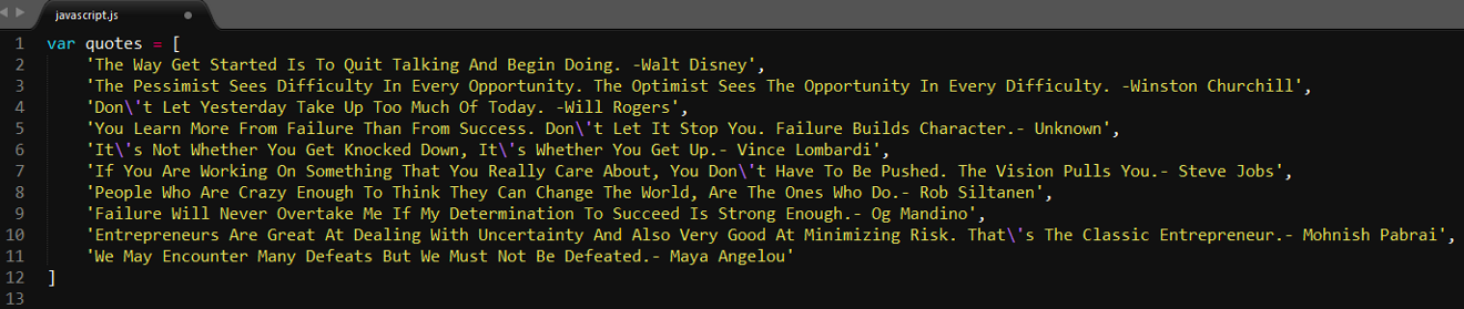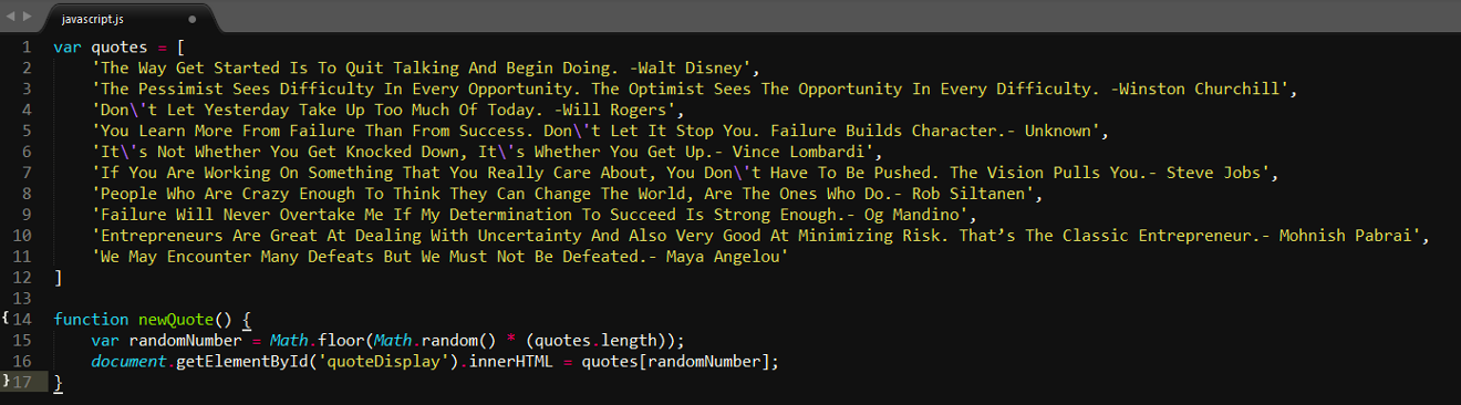![]() 在 freeCodeCamp 社区阅读更多技术文章。 这篇文章主要是面向 JavaScript 初学者的,帮助大家理解如何使用 JavaScript 和 HTML 来创建简单的 Web 应用。 如果你对 JavaScript 和 HTML 完全没有任何经验,也不用担心,我会尽可能详细地讲解每一行代码。在读完这篇文章之后,你将会对 JavaScript 与 HTML 有更深的理解。 我们会创建一个随机名言生成器,每一次点击的时候,它都会在屏幕上随机显示一句名言。这个项目需要以下三点准备,当然啦,其实每一个 Web 项目都需要这三点: