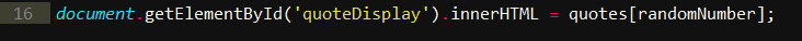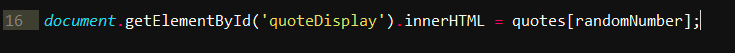 ![]() 为什么不直接乘以 10?如果你之后再添加名言呢?每添加一条,都要手动改变一次数字吗? 现在,我们需要找到一个方法,使用 randomNumber 生成的值来取回相对应的名言,然后将其放在 HTML 文档中,在浏览器中显示出来。 ![]() 将名言放在 HTML 文档中的 quoteDisplay 元素内。 还记得我们之前用 HTML 的 id 属性来允许 JavaScript 获取并操作 HTML 元素吗?这里我们就用上它了: ![]() 使用 document.getElementById(),我们可以让 JavaScript 在 HTML 中查到之前的那个 id。我们还要将 quoteDisplay 作为具体参数,来取回带有 “quoteDisplay” 这个 id 的 HTML 元素。 现在,我们需要使用 .innerHTML 这个方法,将取回的名言作为值,添加到 HTML 中的 quoteDisplay 元素中: ![]() 我们让 innerHTML 等于带有 randomNumber 变量的名言数组,现在 newQuote() 这个函数就写好了! 你的 javascript.js 文件看上去应该类似这样: ![]() 做到这一步,随机名言生成器就做好了,恭喜! 现在你要做的,就是在浏览器中打开这个项目,看看它是否能正常工作。将 index.html 拖到浏览器中,用鼠标点击那个按钮,它应该就会随机显示名言了。 如果你乐意尝试的话,还可以添加更多名言。 具体效果: ![]() 项目源代码: ![]()