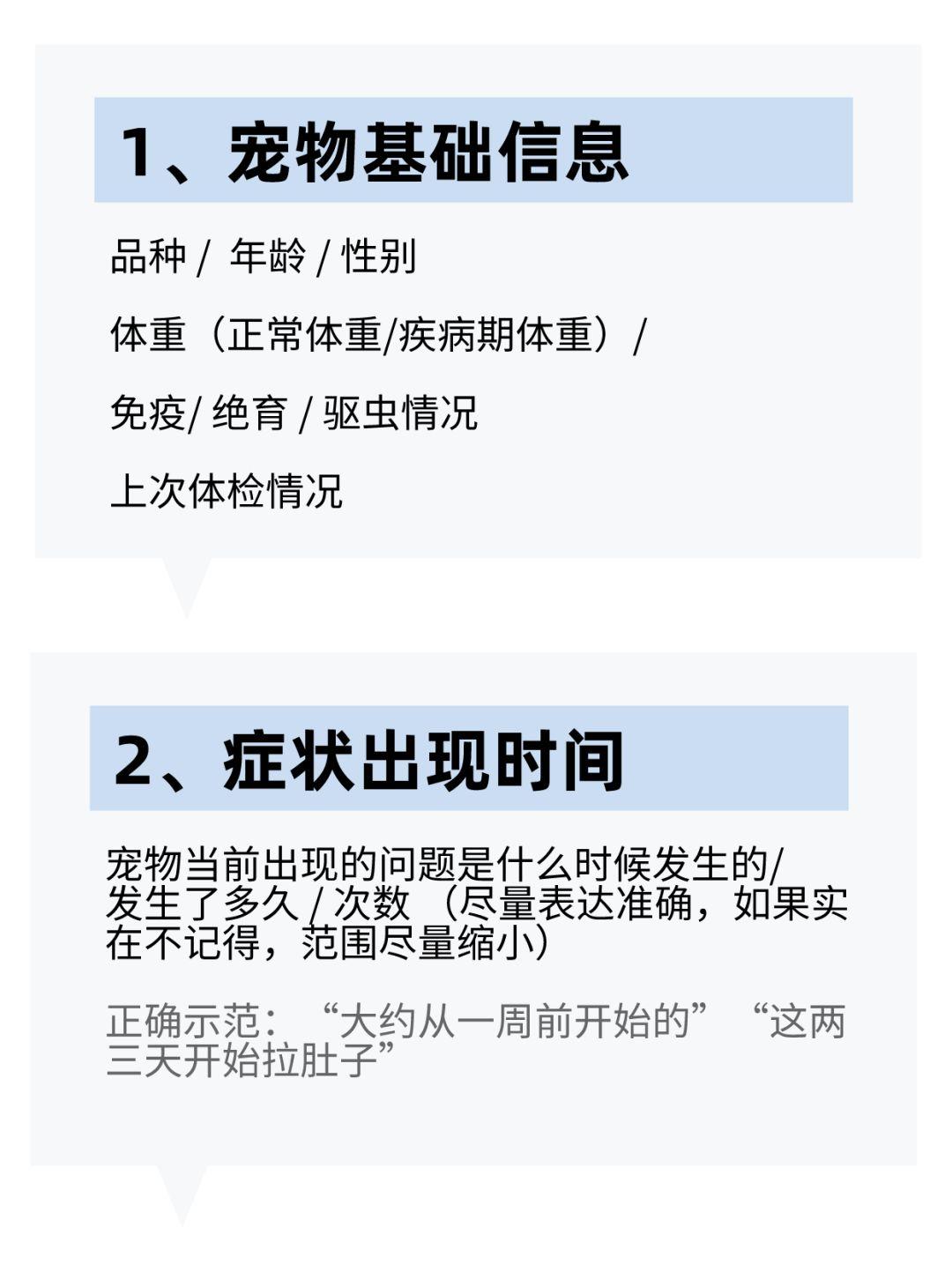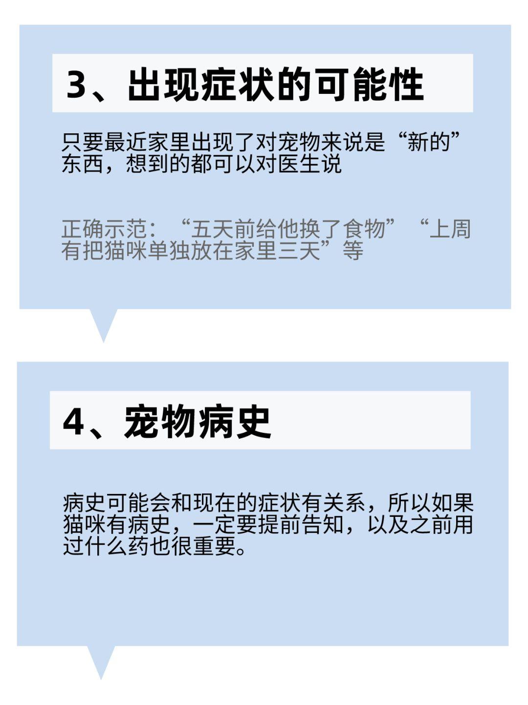 另外,宠物的异常状态,除了口头描述,最好能提供照片/视频记录,更方便医生判断情况。 以上就是宠物医生问诊时常会问的问题,大家提前了解准备,就能和医生更有效沟通啦。注意不要含糊其辞、不要过分慌张夸大/隐瞒病情,如实描述即可。