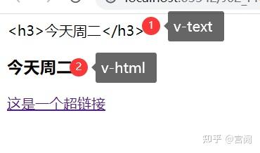 使用v-html指令时,可以将带有HTML标记的字符串作为指令值传递给它。Vue会将这个字符串解析为HTML,并将其插入到元素的innerHTML属性中。这种方法可以用来渲染带有HTML标记的动态内容,而不必通过其他手段将它们转换为纯文本 <body> <div id="app"> <div v-text="msg"></div> <div v-html="msg"></div> <a v-bind:title="biaoTi" :href="url">这是一个超链接</a> </div> <script> let vueApp = new Vue({ el:'#app', data:{ msg:'<h3>今天周二</h3>', biaoTi:'广州蜗牛', url:'https://www.woniuxy.com' } }) </script>