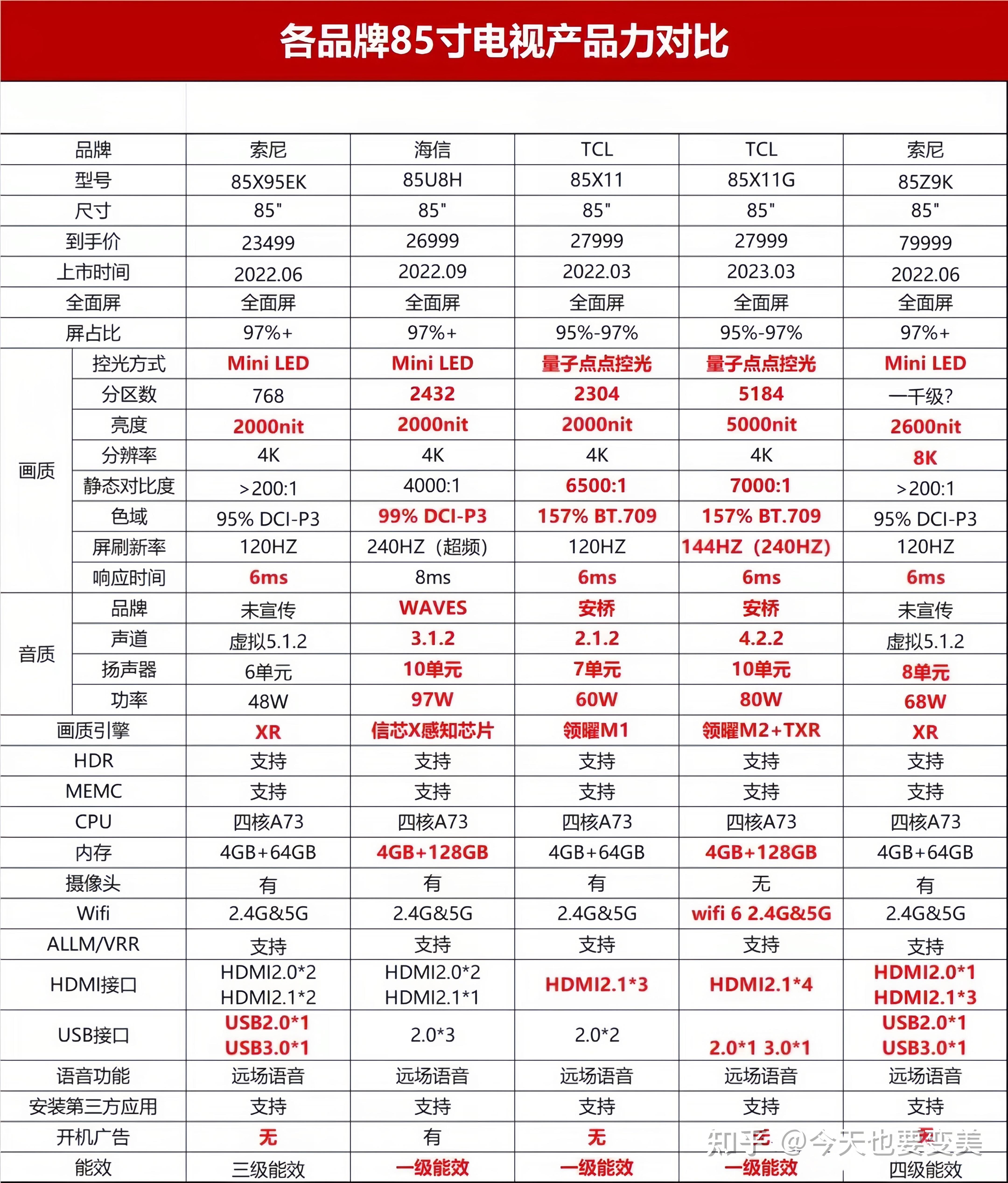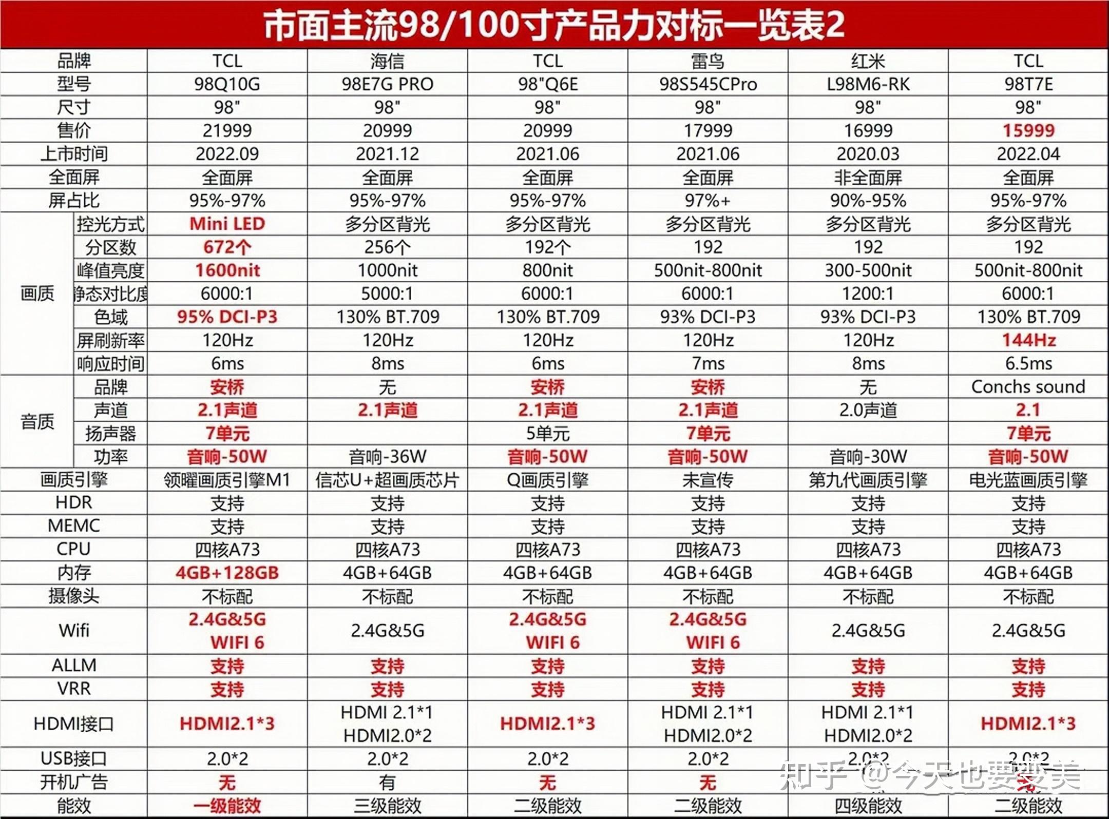 2023准备好买电视了嘛?今天我给大家整理的这些干货一定要掌握! 带你摸清彩电行业发展趋势,买彩电就绝对不会吃亏! 首先,电视行业已经进入下行赛道,中国彩电市场销量连续六年持续下滑,市场重新洗牌是趋势。这意味着在买电视之前,我们需要了解市场动态,选择具有实力和前途的品牌和型号,才能避免花冤枉钱。 ![]() 19-22年 第二,大屏化趋势愈发明显,75寸电视已经成为最主流尺寸。买大屏是趋势,也是越来越多人追求更好视觉享受的选择。虽然价格相对较高,但是随着技术的发展和市场的竞争,大屏电视的价格正在逐渐降低,所以现在是买大屏的好时机。 ![]() 第三,高刷率成为电视行业内最新宠儿,120Hz刷新率将成为电视的标配。这不仅是为了提高视觉效果,更是为了追求更流畅的操作和游戏体验。如果你是游戏爱好者,那么高刷率的电视将会成为你的福音。 ![]() 第四,MiniLED技术成为旗舰电视的最佳选择,年增长率高达近400%!MiniLED技术可以实现更高的对比度和更好的亮度,而且还能够有效避免屏幕烧损的问题。虽然价格相对较高,但是它的性价比非常高,是未来电视的主流选择。 ![]() 知道了这些干货,那接下来怎么买电视才会更加省钱呢? 我分别从以下4点带你深入了解省钱真相。 1、电视品牌如何选?国货已经崛起,买电视还是优先选国产!虽然全球彩电销量排名前三的品牌是三星、TCL、LG,但是自家有屏厂的TCL近几年在全球市场稳步增长,成为中国电视的领跑者。此外,目前全球70%的电视生产都是来自中国的,所以买合资电视就是“智商税”!在选购电视品牌时,一定要选择具有品牌实力和研发实力的国产品牌,这样才能保证产品质量和售后服务。 ![]() 2022全球品牌电视销量 2、电视类型如何选?买电视选液晶,技术成熟性价比高!大屏显示设备有四种,包括投影仪、激光电视、OLED电视和液晶电视。虽然OLED电视的画质效果非常好,但是容易烧屏,使用寿命堪忧。而激光电视和投影仪则亮度和清晰度较低,画质效果非常差。相比之下,液晶电视技术方案最成熟,性价比最高,是大多数消费者的明智选择。此外,随着技术的不断进步,液晶电视的画质和亮度也在不断提升,更能够满足人们对高清晰度和高亮度的需求。 ![]() 就目前而言QD-MiniLED电视就是一种高端的新型液晶电视,采用像素级的点控光技术和量子点技术,融合了传统液晶电视和OLED电视的优点,实现了超高对比度、更广阔的色域和更长的使用寿命。相比传统液晶和OLED电视,QD-MiniLED电视在黑色表现、对比度和可靠性等方面有了显著提升,将大屏显示技术推向了一个新的高度。 ![]() 3、电视画质如何选?想要选择一款高质量的电视,有几个关键的指标需要注意: 首先是背光分区,电视屏幕被分为多个区域,每个区域都有独立的背光控制,这能够带来更深的黑色和更高的对比度。因此,如果你想要更好的画质,选择有分区的电视会比没有分区的电视更好,而且分区数越多越好。 其次是峰值亮度,这是液晶电视非常重要的画质指标。峰值亮度越大,画质表现就越出色,包括清晰度、色彩、细节和层次等都会得到提升。因此,选择峰值亮度较大的电视会带来更好的视觉体验。 ![]() 接下来是色彩,量子点技术是目前最好的电视色彩方案,其次是新红粉高色域技术。电视显示的色彩能力称为色域,色域越好,显示的色彩种类就越多,画面的色彩层次也就更好。因此,选择色彩表现较好的电视,能够让你更好地欣赏电影、电视节目和游戏,享受更为逼真的视觉效果。 最后是清晰度,4K分辨率已经足够,但是需要注意的是要买真正的4K电视,也就是由红绿蓝三种像素组成,分辨率达到3840 x 2160,有效像素点约830万个的电视。一定不要购买假4K电视,因为其有效像素点只有622万个,画面质量也会受到影响。 ![]() 4、买大屏幕,选择什么屏幕类型?液晶电视是目前最普遍的电视类型,也是最经济实惠的选择。液晶电视在画面亮度和色彩表现方面已经有了很大的提升,而且价格也比OLED电视更为合理。如果你想要买一款大屏电视,选液晶电视就是不错的选择,不要花冤枉钱。选择85寸或98寸的大屏电视需要根据自己的实际需求来决定。 在品牌选择方面,各大品牌如小米、TCL、海信、雷鸟、华为和索尼都有热销的大屏电视产品,需要注意的是,每个品牌的电视参数配置都有所不同,红色标注代表优势!注意挑选适合自己的品牌和型号奥。 ![]() ![]() 还有一些选购电视需要注意的细节。例如,选择屏幕尺寸时,根据自己的使用需求和房间大小来选择。此外,在购买电视时,不要被一些商家所谓的“附赠品”所迷惑,要以产品本身的质量和性价比为主要考虑因素。 总之,了解电视选购知识,才能更好地选择合适的品牌和型号,避免花冤枉钱,买到实用、高性价比的电视产品。 |