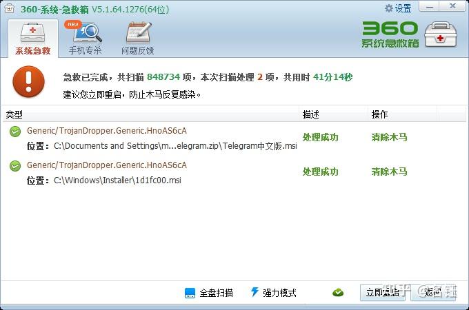 为了保险起见,后面又用360系统急救箱强力模式全盘扫描了一遍。