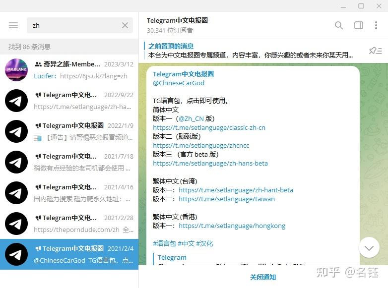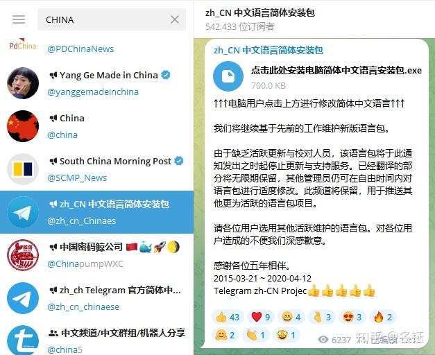 虽然很多大佬们的英文水平都超好,但也有很多像我这样的学渣试用英文或其它语言界面的软件非常不习惯,这个时候老司机们都会去找各种各样的方式来汉化,Telegram中你可以非常方便的搜索zh、CN、China、Chinese等关键词,会自动出现相应的频道,有些频道会提供汉化支持。