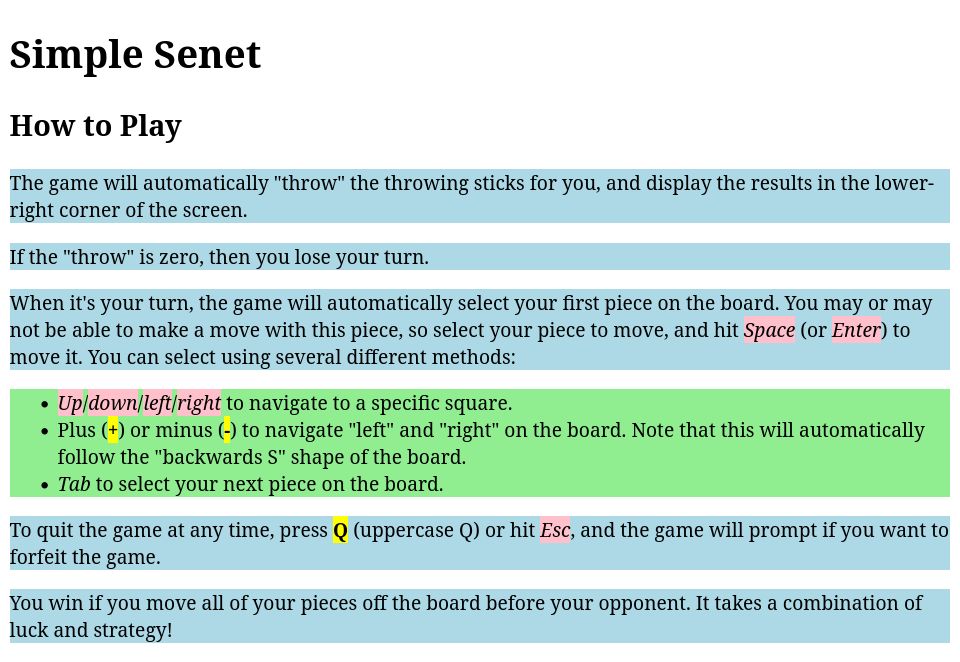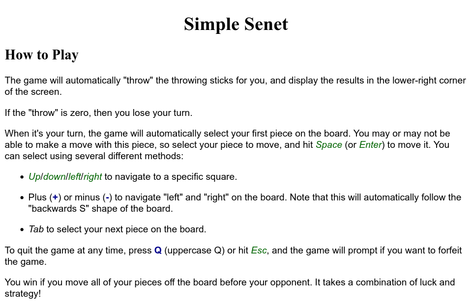 让我们重新开始你的样式表并将这些新样式应用到文档中。首先,在文档中使用更令人愉悦的字体。如果你的 HTML 文档没有指定字体,网络浏览器会为你选择一种。根据浏览器的设置方式,这可能是衬线字体(如我的屏幕截图中使用的字体)或无衬线字体。衬线字体在每个字母上添加了一个小笔画,这样在打印时更容易阅读。无衬线字体缺少这种额外的笔划,这使得文本在计算机显示器上显得更清晰。常见的衬线字体包括 Garamond 或 Times New Roman。 流行的无衬线字体包括 Roboto 和 Arial。 例如,要将文档正文字体设置为 Roboto,你可以使用以下样式: body { font-family: Roboto; }通过设置字体,你假设查看文档的人也安装了该字体。有些字体已经十分常见,以至于它们被认为是事实上的“网页安全”字体。 这些字体包括 Arial 等无衬线字体和 Times New Roman 等衬线字体。Roboto 是一种较新的字体,可能还无法随处可用。因此,网页设计师通常不会只列出一种字体,而是设置一种或多种“备用”字体。你可以通过用逗号分隔来添加这些替代字体。 例如,如果用户的系统上没有 Roboto 字体,你可以使用以下样式定义将 Arial 字体用作文本正文: body { font-family: Roboto, Arial; }所有网络浏览器都定义了默认的衬线和无衬线字体,你可以使用这些名称来引用它们。用户可以更改他们喜欢用于显示衬线和无衬线的字体,因此不太可能对每个人都一样,但在字体列表中使用 如果字体名称不止一个单词,则你必须在其两边加上引号。HTML 允许你在此处使用单引号或双引号。 为标题和副标题定义一些衬线字体,包括 Times New Roman: h1 { font-family: "Times New Roman", Garamond, serif; }h2 { font-family: "Times New Roman", Garamond, serif; } 请注意,H1 标题和 H2 副标题使用完全相同的字体定义。如果你想避免无谓的打字,可以使用样式表快捷方式为 H1 和 22 使用相同的样式定义: h1, h2 { font-family: "Times New Roman", Garamond, serif; }在编写文档时,许多技术作者更喜欢将主标题放在页面的中央。你可以在块元素(例如 H1 标题)上使用 为了让粗体和斜体文本更突出,请将它们置于稍微不同的颜色中。对于某些文档,我可能会使用深蓝表示粗体文本,使用深绿表示斜体文本。这些颜色非常接近黑色,但颜色的细微差别足以吸引读者的注意力。 b { color: darkblue; }i { color: darkgreen; } 最后,我更喜欢在我的列表元素周围添加额外的间距,以使它们更易于阅读。如果每个列表项只有几个词,额外的空间可能无关紧要。但是我的示例文本中的中间项很长,可以换到第二行。 额外的空间有助于读者更清楚地看到此列表中的每个项目。 你可以使用边距样式在块元素上方和下方添加空间: li { margin-top: 10px; margin-bottom: 10px; }这种样式定义了一个距离,此处我将其指定为每个列表元素上方和下方的 10px(十个像素)。 你可以使用多种不同的距离度量。十像素实际上就是屏幕上十个像素的空间,无论是台式机显示器、笔记本电脑显示屏,还是手机或平板电脑屏幕。 假设你真的只是想在列表元素之间添加一个额外的空行,你也可以使用 HTML 文档中的完整样式列表如下所示: <!DOCTYPE html><html> <head> <title>简易 Senet</title> <style> body { font-family: Roboto, Arial, sans-serif; } h1, h2 { font-family: "Times New Roman", Garamond, serif; } h1 { text-align: center; } b { color: darkblue; } i { color: darkgreen; } li { margin-top: 1em; margin-bottom: 1em; } </style> </head> <body> <h1>简易 Senet</h1> <h2>游戏玩法</h2> <p>游戏会自动为你“投掷”投掷棒,并在屏幕右下角显示结果。</p> <p>如果“投掷”结果为零,你失去本轮机会。</p> <p>轮到你的时候,游戏会自动选择 你在棋盘上的第一块棋子。 你不一定 能够用这个棋子走棋。所以选择你的棋子 移动,然后按 <i>Space</i>(或 <i>Enter</i>)移动 它。 你可以通过几种不同的方法进行选择:</p> <ul> <li><i>向上</i>/<i>向下</i>/<i>向左</i>/<i>向右</i> to 朝特定方块移动。</li> <li>加号 (<b>+</b>) 或减号 (<b>-</b>) 使棋子在棋盘上向“左”或向“右”移动。 请注意,它们会自动遵循棋盘的“倒过来的 S”方向移动。</li> <li><em>Tab</em>在棋盘上选择下一个你想要移动的棋子。</li> </ul> <p>要随时退出游戏,请按 <b>Q</b>(大写 Q)或按 <i>Esc</i>,这样游戏会提示你是否想要 放弃比赛。</p> <p>如果你比对手更快将所有棋子移出棋盘,你就赢得了比赛。 这同时需要运气和游戏策略!</p> </body> </html> 在网页浏览器上查看时,你会看到采用无衬线字体的自述文件,标题和副标题使用衬线字体。 页面标题居中。粗体和斜体文本使用略有不同的颜色来吸引读者的注意力而不会分散注意力。 最后,列表项周围有额外的空间,使每个项目更易于阅读。 ![]() 通过添加一些样式,我们使这个自述文件更易于阅读。 这是在技术写作中使用样式的简单介绍。掌握了基础知识后,你可能会对 Mozilla 的 HTML 指南 感兴趣。它包括一些很棒的初学者教程,因此你可以学习如何创建自己的网页。 有关 CSS 样式的更多信息,我推荐 Mozilla 的 CSS 指南。 (题图: MJ:web internet traffic design) via: https://opensource.com/article/22/8/css-html-project-documentation 作者:Jim Hall 选题:lkxed 译者:XiaotingHuang22 校对:wxy 本文由 LCTT 原创编译,Linux中国 荣誉推出 |