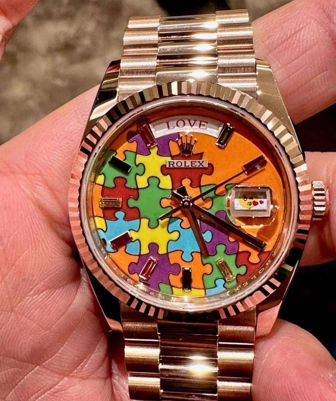 另一个就很牛逼了。 DD的最新款。盘面长得像拼图,但是内填珐琅工艺。 12 点钟位置设弧形窗,不显示星期,而是展示鼓舞人心的英文主题词汇 3 点钟位置的视窗以31 种专属表情符号取代日期显示。有白金、黄金和玫瑰金三个版本。