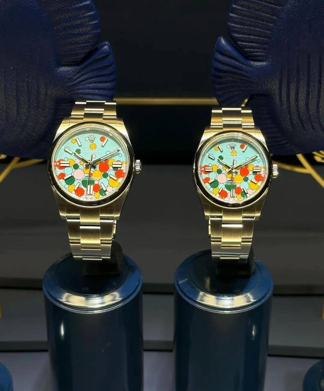 第七,36毫米星期日志。 今年劳力士最惊艳的新品,绝对是36毫米的星期日志。 一个是宝石盘,好看,但还属于常规。绿色砂金石,红玉髓以及绿松石,全部都是钻圈。