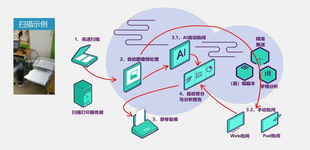 前端,由智能识别技术完成学生答案的数字化转换;后端,由大数据分析,实现批改的智能化。