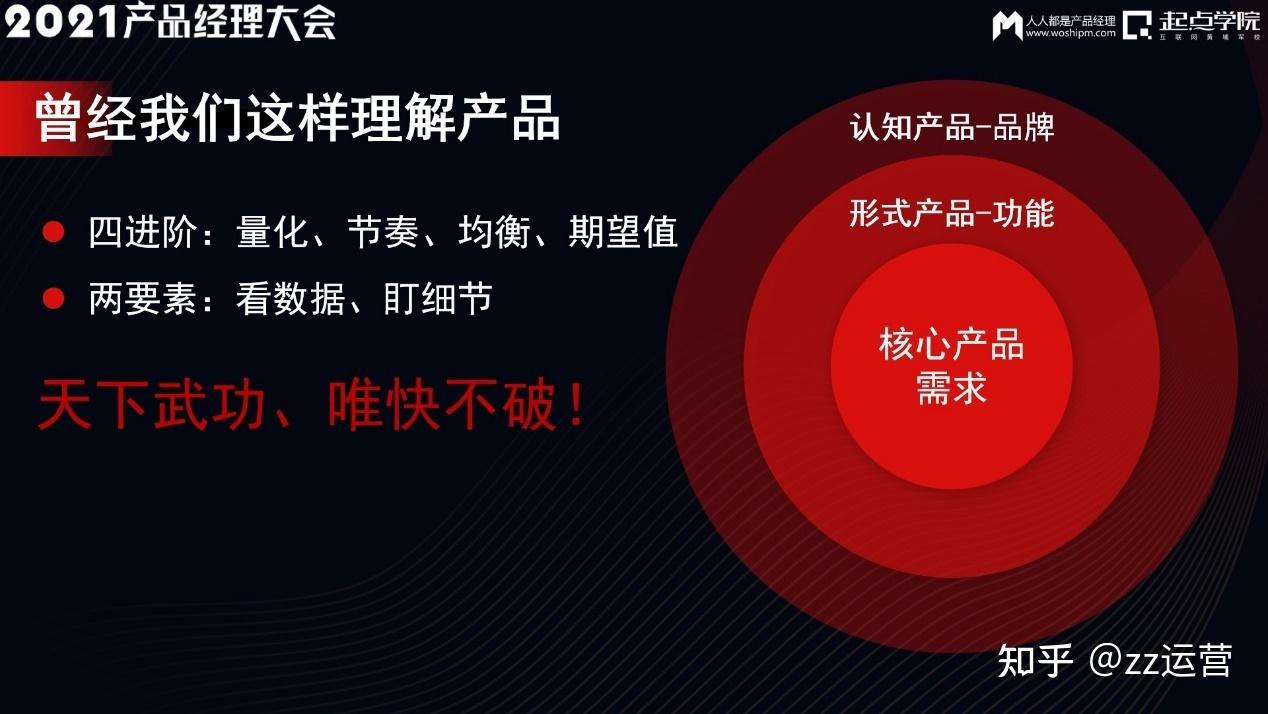 在我的成功经历中,时代的红利占据了一定的重要性。所以每十年一个大变化,我们产品经理,要想有所成就、脱颖而出,就要把握唯一的机会,把握大的变局。 一、过去我们是怎样理解产品的?![]() 过去,我认为产品分为三个同心圆,最中间的是核心产品需求,从里向外依次是形式产品——功能、认知产品——品牌。当然,外面还有一圈,即运营。 好的产品,从最核心的需求到功能、到品牌,乃至最外层的运营,应是一线贯通、整体完整的。 为什么要完整?举个例子,从形式产品来说,语音助手这种产品形态是一种产品。像Siri这样的聊天工具、“小爱同学”这样的控制工具、理财助手等产品,它们的形态是一样的,但它们解决的是不同的需求。 核心产品和形式产品,做的时候要立足于最终的需求,不能从功能去考虑问题。还有一点,哪怕你功能做得再好,你是谁,和用户认为你是谁是不一样的。 做产品的时候要保持这三个同心圆的一致。但是就需求而言,基本上都从用户需求出发。我们当时认为:需求,一点打透,做完一点打一点。这是之前我们对产品的理解。 我个人对产品经理的要求,简单来讲,叫“四进阶,两要素”。 四进阶: