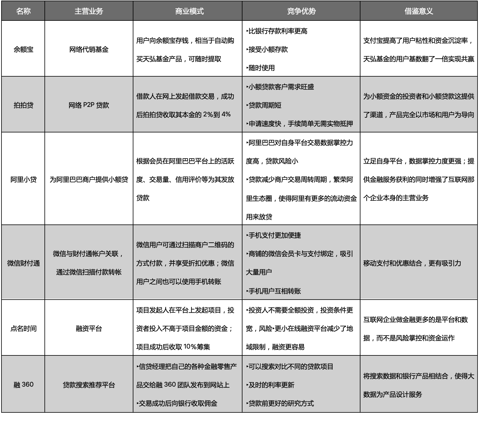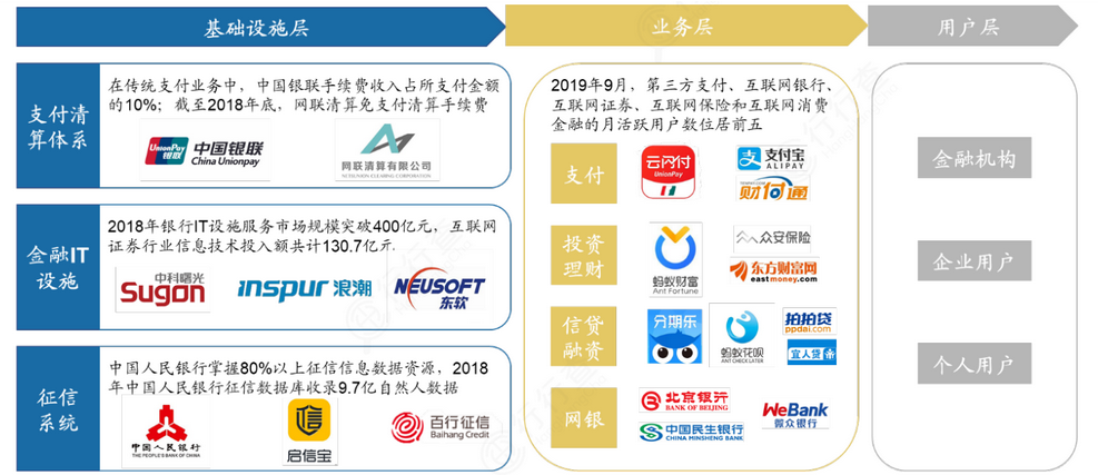 (2)互联网金融行业顾客的议价能力。行业顾客可能是行业产品的消费者或用户,也可能是商品买主。顾客的议价能力表现在能否促使卖方降低价格,提高产品质量或提供更好的服务。 (3)互联网金融行业供货厂商的议价能力,表现在供货厂商能否有效地促使买方接受更高的价格、更早的付款时间或更可靠的付款方式。 (4)互联网金融行业潜在竞争对手的威胁,潜在竞争对手指那些可能进入行业参与竞争的企业,它们将带来新的生产能力,分享已有的资源和市场份额,结果是行业生产成本上升,市场竞争加剧,产品售价下降,行业利润减少。 (5)互联网金融行业替代产品的压力,是指具有相同功能,或能满足同样需求从而可以相互替代的产品竞争压力。 表 典型案例 ![]() 资料来源:资产信息网 千际投行 3.6 中国企业重要参与者中国互联网金融行业主要参与企业有ST易购[002024.SZ]、生意宝[002095.SZ]、金证股份[300312.SZ]、ST熊猫[600599.SH]、世联行[002285.SZ]、中迪投资[000609.SZ]、三六五网[300295.SZ]、信雅达[600571.SH]、上海钢联[300226.SZ]、东易日盛[002713.SZ]、大智慧[601519.SH]、新力金融[600318.SH]、汇金股份[300368.SZ]、证通电子[002197.SZ]、中天金融[000540.SZ]、二三四五[002195.SZ]、中科金财[002657.SZ]、恒宝股份[002104.SZ]、*ST金洲[000587.SZ]、海峡创新[300300.SZ]等。 图 港股及A股主要公司 ![]() ![]() 资料来源:资产信息网 千际投行 同花顺iFinD (1)陆金所[LU]:全称上海陆金所信息科技股份有限公司,平安集团旗下成员,2011年9月在上海注册成立,注册资本金8.37亿元,总部设在国际金融中心上海陆家嘴。陆金所是上海一家通过国务院交易场所清理整顿的金融资产交易信息服务平台。 陆金所旗下网络投融资平台2012年3月正式上线运营,是中国平安集团打造的平台,lufax结合全球金融发展与互联网技术创新,在健全的风险管控体系基础上,为中小企业及个人客户提供专业、可信赖的投融资服务,帮助他们实现财富增值。截至2021年9月末,注册用户已逾4870万 。 (2)蚂蚁集团[蚂蚁金服]:注册于浙江,隶属于浙江阿里巴巴电子商务有限公司,成立于2014年10月,CEO彭蕾。蚂蚁金服致力于打造开放的生态系统,为小微企业和个人消费者提供普惠金融服务,2020年7月蚂蚁金服正式更名为蚂蚁集团。 (3)财付通: 注册于深圳,隶属于腾讯集团,成立于2006年8月,注册资本10亿元,董事长马化腾。财付通致力于为互联网用户和企业提供在线支付服务。据财付通官网显示,财付通服务的个人用户已超过2亿,服务的企业客户也超过40万,覆盖的行业包括游戏、航旅、电商、保险、电信、物流、钢铁、基金等。结合这些行业特性,财付通提供了快捷支付、财付通余额支付、分期支付、委托代扣、epos支付、微支付、等多种支付产品。 3.7 全球重要竞争者全球非中国主要企业有LendingClub[JT.N]、纳斯达克[NDAQ.O]等。 图 美股主要上市企业 ![]() 资料来源:资产信息网 千际投行 同花顺iFinD (1)LendingClub[JT.N]:以SocBank Corporation的名字于2006年10月在美国特拉华州注册成立,并于2006年11月更名为LendingClub Corporation。该公司是世界上最大的链接借款人与投资者的在线市场。2014年12月12日,LendingClub正在通过IPO获得大量资金。该公司再度上调了发行价至每股15美元,并增发30万股,使其总融资金额达到了8.7亿美元,2014年总市值达54亿美元 [1] 。LendingClub于2014年12月12日开始在纽交所挂牌交易,代码LC。 (2)纳斯达克[NDAQ.O]:成立于1971年,是FINRA的全资子公司。从2000年开始,FINRA通过向FINRA成员、投资公司和在纳斯达克股票市场上市的发行人出售股票,重组并扩大了纳斯达克的所有权。纳斯达克是一家服务于资本市场和其他行业的全球性科技公司。其多样化的数据、分析、软件和服务使客户能够满怀信心地优化和执行其业务愿景。公司管理、经营和提供四个业务部门的产品和服务:市场服务、企业服务、信息服务和市场技术。 第四章 未来展望发力零售和小微金融,传统机构科技赋能 随着国内经济转型,商业银行需要大力发展零售和小微企业金融业务。互联网金融业务能够满足更多个人客户、小微企业对小额、分散的贷款需求,成为大多数银行考虑开展的领域。不少银行已将发展金融科技提升到全行战略引领层面,在人才团队建设、专项资金投入上持续发力。并且面对2020年突如其来的新冠肺炎疫情,金融科技在助力银行业转型时被赋予了特殊的使命,各机构纷纷借助金融科技推出“非接触银行”服务,有效助力疫情防控和社会经济活动恢复,同时也促使自身业务数字化水平取得巨大进步。 目前,商业银行已经将金融科技融入企业发展的生态圈,金融科技成为企业发展战略或业务执行的一部分。金融科技领域建设可以分为三类:以分布式改造为代表的核心系统建设;人工智能、大数据、区块链等新型技术赋能银行业务;服务于线上渠道的生态场景建设。 强监管下,互联网平台需清本溯源、回归初心 互联网改变了金融服务的供给方式,但没有消除金融固有风险,业务不具有风险上的特殊监管待遇。从2015年下半年开始,互联网金融就进入到了强监管时代。一方面,互联网金融是互联网科技与传统金融行业相结合的创新产物,在发展初期阶段势必会出现一些风险,这就需要加大监管的力度,尽快度过风险的高发期。另一方面,在金融领域,监管始终在不断完善,对于新兴的互联网金融