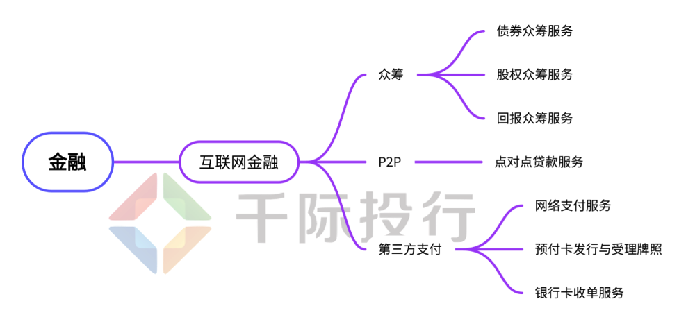 第一章 行业概况“互联网金融”是以互联网为载体进行的金融业务活动,包括但是不限于为第三方支付、在线理财产品的销售、信用评价审核、金融中介、金融电子商务等模式。从广义上讲,具备互联网精神的金融业态统称为互联网金融。该主题主要涉及:第三方支付平台,金融软件企业,部分电商平台及其他通过互联网进行金融创新的相关企业。 图 互联网金融行业结构图 ![]() 资料来源:资产信息网 千际投行 互联网金融的分类
