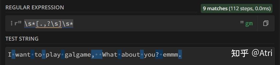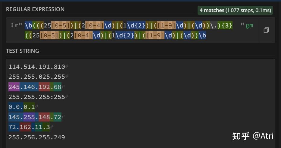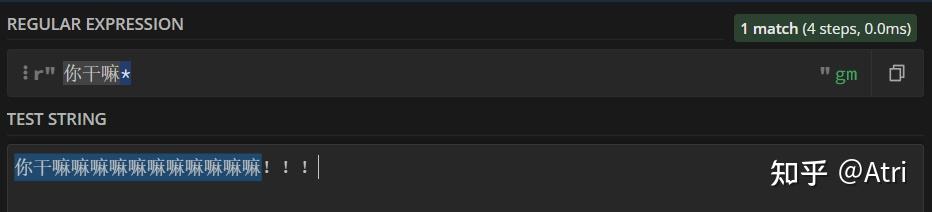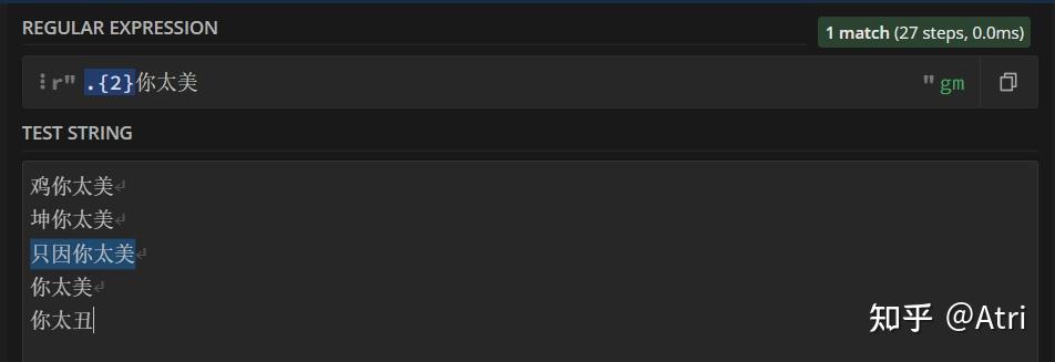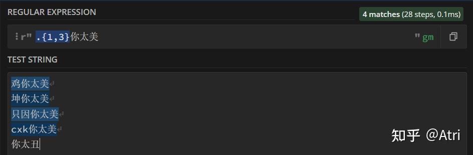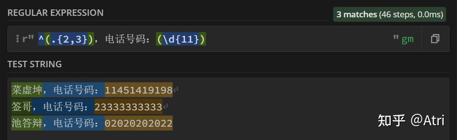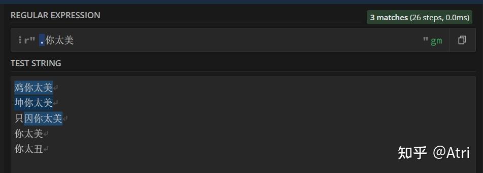 0 前言如果你稍微接触过算法竞赛,应该学过字符串匹配中的KMP算法。它是在一个文本串中寻找一个固定的模式串所出现的位置。而正则表达式就是它的升级版,区别在于这个特殊的模式串可以匹配多个不同的满足一定条件的字串。也就是不固定的。 事实上,虽然本文的title叫做python进阶,但其实正则表达式在其它语言(最常见的例如前端开发的javascript、以及python爬虫等)中也有运用,只不过笔者想要稍微有针对性一点。 如果你在外网期刊数据库上检索过一些文章,可以发现其检索语法和正则表达式很像。 如果你和我一样,懒得写程序,可以使用这个在线网站:https://regex101.com/。适配语言使用python即可. 当然其它也大同小异。 如果你是个python萌新,那么请放心阅读,因为我也是。 如果你是个大佬,请轻喷。 1 基础部分首先引出普通字符的概念,也就是正则表达式中直接进行匹配的字符,例如 "原神": ![]() 高亮部分即为匹配成功部分 但这就没办法体现出正则表达式的厉害之处了,因此我们首先介绍一下元字符: 1.1 单个字符匹配[.]这里的 '.' 是我们介绍的第一个元字符,其不代表真正的英文句点,而是代表除了换行符外的任何字符。 例如下面这个例子: ![]() 只能匹配一个字符,这让我怎么荔枝 你会发现,这个 '.' 在原文本中匹配了不同的单个文字,例如“鸡”,“坤”。 放到python中,实现如下: import re #regular expressioncontent = ''' 鸡你太美 坤你太美 只因你太美 你太美 你太丑 '''#单三引号,可以直接输入换行 p = re.compile(r".你太美") #获得模式串 print(type(p)) for item in p.findall(content): #findall 返回个列表 print(item) 运行结果如下: <class 're.Pattern'>鸡你太美 坤你太美 因你太美 首先,我们需要导入 re 这个包(一般是python自带的),它是regular expression的简称,提供正则表达式的支持。 然后,content存了我们的文本串。这里使用单三引号,支持直接对内容进行多行描述。 然后,我们调用re.compile函数,里面是我们的正则表达式(这里的r是将转义字符恢复成原有字符,例如'\n'不代表换行符,因为其已经被恢复成原有的反斜杠和'n'),获得一个p变量,其类型为<class 're.Pattern'>,你可以认为是一个特殊的模式串,我们要通过这个模式串进行模式匹配。 然后该变量是类的一个实例,其拥有一个方法p.findall(),它返回的是一个列表,而在这里其内容便是我们成功匹配的子串啦!当然,待会会介绍另一个个人感觉更优的方式。 但是,如果我们也想匹配不止一个字符,该怎么办呢? 1.2 任意数量匹配[*]上个例子中,发现我们匹配的结果“因你太美”中缺少了 '只' 字,这下ikun们不满意了。辣么我们怎么办呢? 尝试一下在上面的正则表达式 '.你太美' 中句号后面加个星号: ![]() 欸,这下整个“只因”都匹配进去了! 分析一下原理:既然 '.' 代表任意字符,而 '*' 代表任意数量,那么 '.*' 不就代表任意数量的任意字符了吗?注意,这里的 '*' 不代表任何字符,它是根据前一个字符而决定的。例子: ![]() 这里的星号代表任意数量的'嘛' python程序就没必要给出了。 1.3 严格大于0的数量匹配[+]这里介绍元字符:'+',其功能与 '*' 极其相似,唯一区别是在于 '+' 必须匹配大于0个的字符,而 '*' 可以匹配等于0个字符: ![]() 可以和上面的图对比一下~ 1.4 使用花括号进行匹配次数的限制对于上面所介绍的星号和加号,我们对其匹配字符的个数加以限制,这时候我们就需要花括号了。 例如,我们想匹配准确的2个字符,可以这样: ![]() 在所要限制的字符(这里是元字符'.')后面加个花括号,里面是你要匹配的字符个数。 当然,花括号里面也可以是一个区间: ![]() 区间中间用逗号隔开。 1.5 匹配单个或零个字符 [?]如果我们想要匹配区间 [0,1] 个字符,除了上述花括号的写法{0,1},还可以直接使用问号 '?'. 具体例子就不给出了,你应该知道该怎么写。 1.6 首尾标志符 [^][$]如果我们想让匹配的字符在一行的开头,我们可以在最前面加个首标志符 '^': ![]() 如果你按照上面的模板写程序: import recontent = '''applea banana aaappp''' p = re.compile(r'^a+') for item in p.findall(content): print(item) 可以发现其只输出了一个 'a',而理论上应该还要输出 'aaa',这是怎么回事呢? 原来,这里程序里的 '^' 并不代表一行的开头,而是代表整个文本的开头,因此,我们需要在compile函数内修改匹配模式。 如果使用多行模式(这样每一行都有一个开头),我们可以加个参数 re.M: import recontent = '''applea banana aaappp''' p = re.compile(r'^a+',re.M) for item in p.findall(content): print(item) 运行一下试试看! 相对应的,'$' 则代表行尾或者文本尾,取决于你使用的模式。 2 对于字符的进阶处理主要的元字符已经介绍完了!但是如果我们的文本内容本身就有元字符,而我们又想匹配它,该怎么办呢? 2.1 转义转义,顾名思义,你可以理解为转化一个字符的含义。例如常见的 '\n' 代表换行。 而这里,我们同样使用反斜杠 '\' 来进行转义。例如 '\.' 就代表 '.' 这个字符,而 '\?' 就代表问号: ![]() 诶等一下下!这个括号是啥?这个 '|' 又是啥? 如果你学过C,可以知道 '|' 是按位或的意思,在这里你可以理解为可以同时匹配 '.' 和 '?'。 而括号就涉及到后面要介绍的分组的概念。因此,如果你直接写代码: import recontent = '''鸡.你太美 坤.你太美 只因.你太美 cxk?你太美 你太丑''' p = re.compile(r'(\.|\?)你太美') for item in p.findall(content): print(item) 其输出: .. . ? 诶?为什么不返回