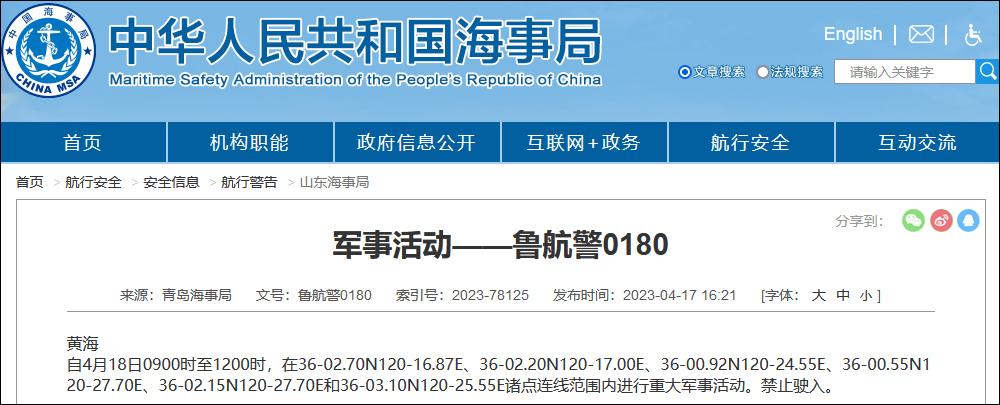 全文如下: 军事活动——鲁航警0180 黄海 自4月18日0900时至1200时,在36-02.70N120-16.87E、36-02.20N120-17.00E、36-00.92N120-24.55E、36-00.55N120-27.70E、36-02.15N120-27.70E和36-03.10N120-25.55E诸点连线范围内进行重大军事活动。禁止驶入。