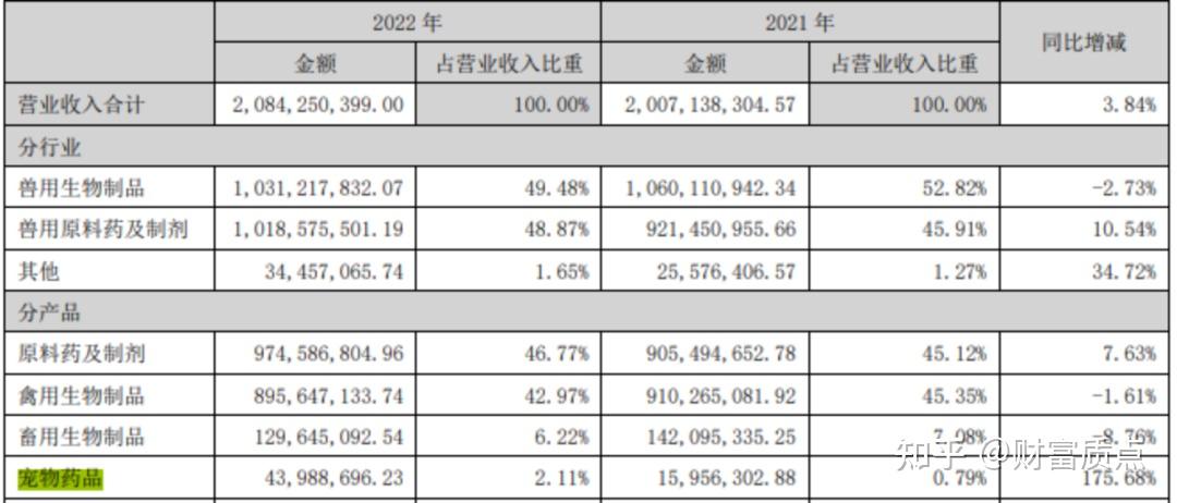 圣农发展是中国规模最大的自养自宰白羽肉鸡专业生产企业,且是A股上市企业。 瑞普生物指出,考虑到未来市场和经营情况的不确定性,且交易标的最近一个会计年度亏损,本次投资购买股权存在一定的经营风险,公司将遵循积极、谨慎的原则完善投资决策机制、内部控制制度,进一步强化投后管理工作,密切关注圣维生物发展及经营情况,做好风险的防范和应对。 #03 瑞普生物的野心 瑞普生物成立于2001年,主营生物技术,兽药的研发销售,货物和技术的进出口等项目,公司法定代表人为李守军。 历经10年发展,瑞普生物已经长大为国内兽药行业规模最大、产品最齐全的企业之一,并于2010年9月上市。 作为兽药行业头部企业,瑞普生物保持着较高的市场份额。 在2022年业绩说明会上,瑞普生物表示,公司聚焦头部养殖企业,已与国内众多头部养殖集团建立战略合作关系,目前,家禽养殖集团TOP200覆盖率100%, 家畜养殖集团TOP100覆盖率90%。 瑞普生物还提到,未来将在家禽板块持续加大研发投入,推进产品迭代升级、工艺创新,不上市新产品。预计2023年蛋鸡、肉鸡养殖行情整体趋好,养殖行情将助推瑞普生物家禽板块经营持续向好。 在此背景下,瑞普生物与养鸡大王旗下企业合作,也是顺理成章。 巩固原有业务之外,宠物药成为瑞普生物近年来重点发力的赛道。 据瑞普生物介绍, 其在宠物板块不断深耕产业生态系统构建,已在宠物疫苗、宠物治疗药物、宠物诊断试剂、宠物营养健康等领域前瞻性布局产品并持续研发投入,拥有与国际接轨的高质量宠物医药产品矩阵,包括抗寄生虫药、耳药、皮肤外用药、抗菌抗病毒药、麻醉镇痛药、疫苗、生物制品、洗消及营养保健产品等9大领域覆盖12种剂型的宠物医药产品,布局形成了纵深拓展的销售渠道护城河。 2022年全年,瑞普生物宠物药品业务实现销售收入0.44亿元,同比增长175.68%。