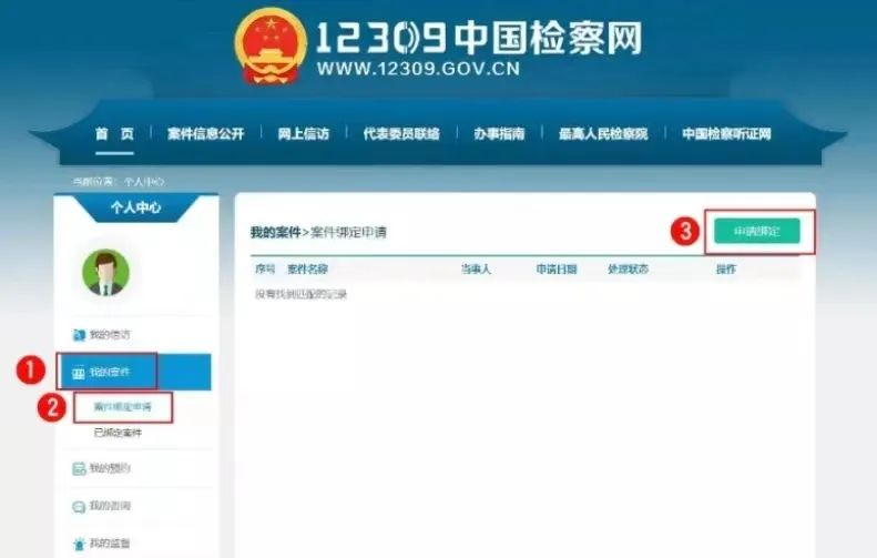 点击12309中国检察网首页【我的案件】-【案件绑定申请】,进入“案件绑定申请”列表,点击【申请绑定】,进入“案件绑定信息填写”页面,填写相关申请信息,点击【确定】提交后,案件办理院的检察人员将对申请信息进行审核,案件绑定结果将以短信的方式通知律师。