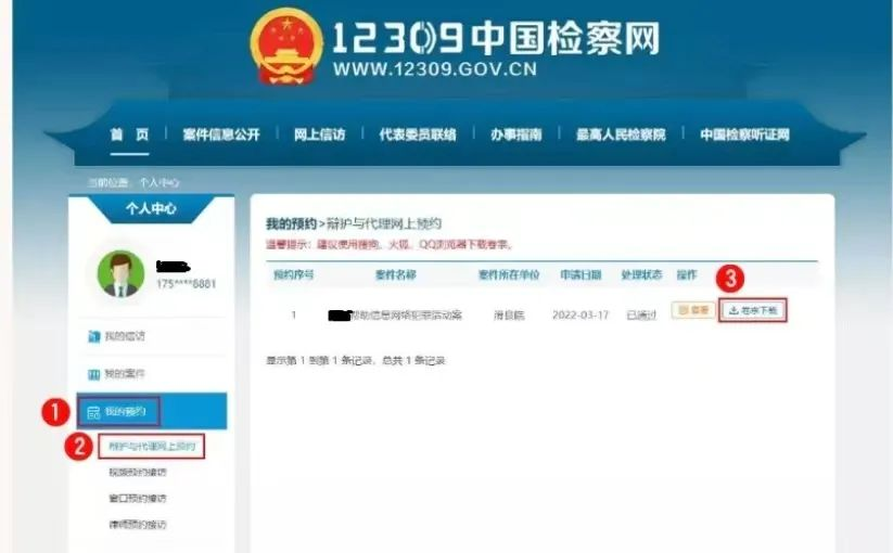 案件办理院检察人员处理完毕后,律师将收到包含卷宗下载密码和卷宗文档打开密码的短信,登录12309中国检察网,点击首页【我的预约】-【辩护与代理网上预约】,进入“辩护与代理网上预约”列表,点击【卷宗下载】,进入“律师身份核验”页面,使用手机微信小程序“中国律师身份核验”中“扫一扫”功能扫描12309中国检察网页面二维码,在弹出窗口填写卷宗下载密码完成卷宗下载,下载完成后,输入卷宗文档打开密码即可进行阅卷。
