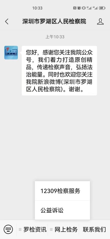 或者关注“深圳市罗湖区人民检察院”公众号,点击“12309检察服务”直接链接到“12309中国检察网”。