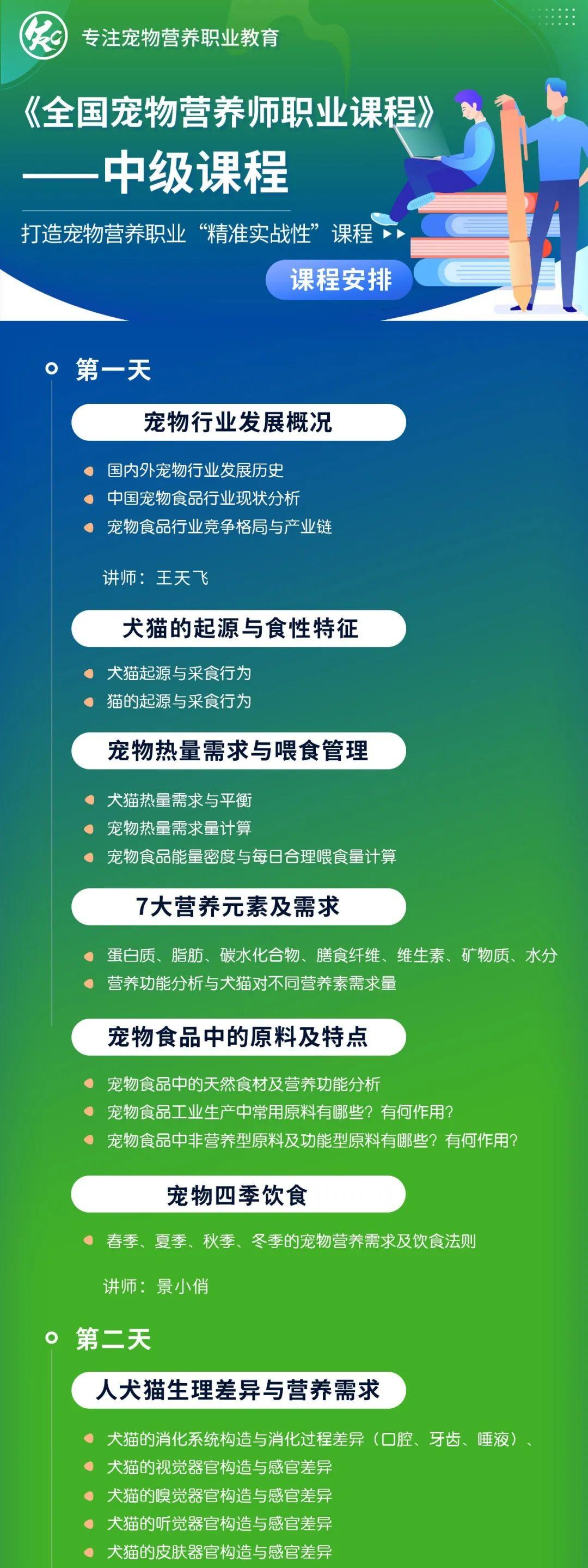 每期报名人数有限,请尽快预定哦~ 学员权益 01 线上+线下引导式学习训练,让成果看得见 中级6+3, 高级8+4 02 线上线下训练营,学员首年免费复听特权 03 每月学员直播课,大咖导师面对对,经典案例拆解、直播答疑、项目问诊 04 宠物营养行业3大权威认证体系,学考评一体化 05 宠物营养职业学习资料库,实战工具资源共享,获取独家资料 06 学员奖励机制,优秀学生丰厚奖品等你拿 07 抖音达人MCN扶持计划,学员直通 宠物营养师中高级班 全国宠物营养师职业课程的中级课程和高级课程,二者之间是递进的学习体系。 《中级课程》以《犬猫营养需求》学科为基础,贴近应用方向,是针对宠物营养与食品相关领域的从业人员必修课程。 《高级课程》以宠物营养在宠物行业各细分领域和实际岗位中的应用为目标,打造宠物行业“职业技能”实战性课程。