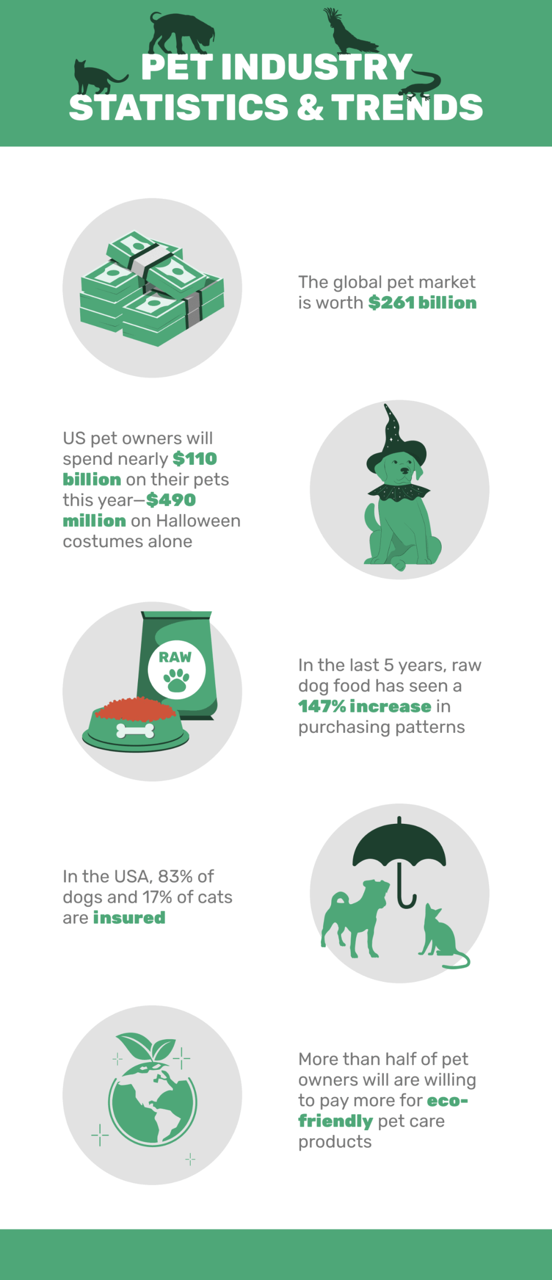 图片来源:Pet Keen 宠物行业整体市场趋势 宠物行业涵盖了各种各样的服务和产品。宠物行业中出现上升趋势的分支是宠物食品和零食、健康和保健、宠物美容和用品以及旅游。以下是关于当前行业和市场价值的详细信息。 1.全球宠物市场价值2610亿美元。 (Global Industry Analysts) 宠物产业不仅在美国发展,而且在国际范围内也在发展。新冠大流行迫使更多人待在室内或在家工作。这导致人们对宠物作为伴侣的需求增加,从而提高了收养率。宠物收养数量的增加促进了不同宠物行业分支的财务增长:食品、兽医护理、玩具和美容需求。目前全球市场价值接近2610亿美元,预计到2027年将达到3500亿美元左右。 2.据预测,到2022年美国人将在宠物身上花费近1096亿美元。 (APPA) 在过去的几年里,人们花在宠物身上的钱一直在稳步上升。新冠病毒是2020年宠物收养数量增加的主要原因之一。人们将继续在不断增长的宠物行业的各个分支上为他们的宠物花钱,即使人们与大流行的社交距离在减少。 3.2020年,美国宠物食品的销量增长了18%。 (Pet Food Industry) 2020年被收养的宠物数量的增加自然导致了对宠物食品的更大需求。与2019年宠物主人在食品上的支出相比,这18%的支出增长相当于56.5亿美元。