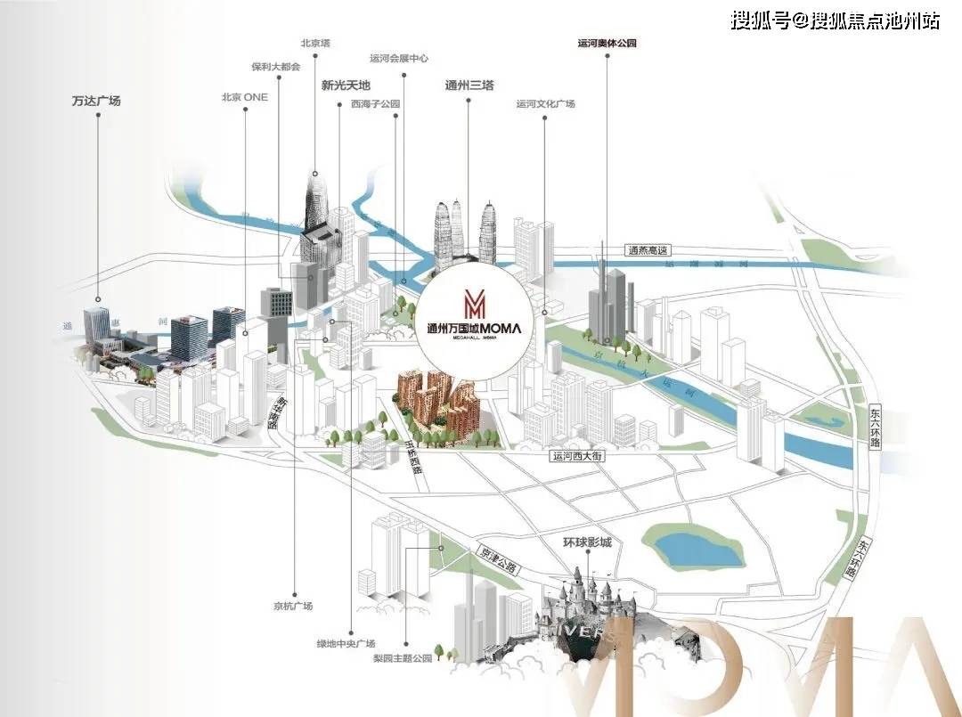 来源于网络:示意图 通州万国城MOMΛ西临运河商务区,约500米范围内,约647路、589路、552路等16路公交车可达,距八通线九棵树站约1.8KM,广渠路二期、京通快速路直抵城心;约1.5公里范围内,运河小学、首师大附中等学校环伺,三甲至专科医院达20所;附近万达广场、九棵树醇熟商圈聚集;在便捷交通、三甲医院、优质教育等丰盛城市配套的簇拥下,引领通州高品质宜居生活。