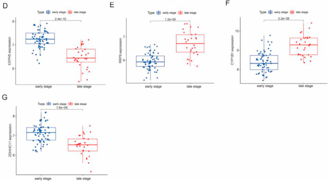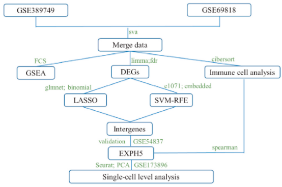 如果你关注的疾病已经有生信文章发表了,还能再做生信思路吗? 如果能,怎么做? 看完这篇你就知道了~ 小云告诉你解决方法之一就是从疾病本身的分组找创新,分析疾病的亚组。比如只关注儿童脓毒症,再比如分析左侧结肠癌 vs 右侧结肠癌,或者只关注肿瘤的晚期(Ⅲ-Ⅳ期)等等。 (没有思路、不知道怎么创新的来找小云吧,超多新奇的分析思路供你选择!) 但是单纯的从疾病分组创新能发6分+纯生信?当然还有机器学习和单细胞来助力。 今天小云要分享的这篇文章有几个亮点: 亮点一:从疾病不同分期(COPD早期和晚期)角度进行切入分析; 亮点二:2种机器学习算法筛选诊断基因; 亮点三:单细胞数据分析关键基因的表达与定位。 快来跟着小云一起学习它的巧妙之处吧。 ![]() ![]() 数据来源 ![]() 研究思路 分析慢性阻塞性肺病(COPD)GEO数据集中早期和晚期的差异表达基因(DEGs)。GSEA分析COPD早期和晚期之间的通路。通过LASSO和SVM-RFE筛选出晚期COPD的候选诊断生物标志物EXPH5。ROC曲线评价其诊断准确性。CIBERSORT算法用于评估两个COPD分期之间组织浸润免疫细胞的分布。分析诊断标志物EXPH5基因与免疫细胞浸润的关系。进一步分析了单细胞转录组数据中EXPH5基因的表达。 ![]() 分析流程图 研究结果 1.筛选COPD早期和晚期的差异表达基因(DEGs),并进行功能分析 对GEO数据中早期和晚期COPD样本进行差异表达分析,并利用metscape数据库进行GO和通路分析(图1A),还进行了GSEA(图1B-C),以确定DEGs的生物学功能。 ![]() ![]() 图1. COPD早期和晚期DEGs的功能分析 2.通过LASSO和SVM-RFE鉴定EXPH5基因为诊断生物标志物 利用LASSO逻辑回归算法从DEGs中识别出19个与COPD相关的基因(图2A)。使用SVM-RFE算法识别出6个关键基因(图2B)。两者取交集获得4个关键基因(图2C),并分析它们在COPD早期和晚期的表达水平存在显著差异(图2D-G)。 ![]() ![]() 图2筛选COPD早期和晚期的候选诊断标志物 使用GSE54837数据集作为验证队列,验证四个候选诊断生物标志物的表达水平。其中EXPH5在COPD晚期样本中的表达水平较早期明显下调(图3A)。ROC曲线评估EXPH5的诊断价值(图3E-F)。 ![]() 图3.诊断基因的验证和ROC曲线 3.分析COPD早期和晚期的免疫细胞浸润,以及EXPH5与浸润免疫细胞的相关性 通过CIBERSORT算法计算出COPD早期和晚期免疫细胞浸润的比例(图4B)。进一步分析COPD晚期EXPH5表达水平与免疫细胞浸润的相关性(图4A、F)。 ![]() 图4. 免疫浸润分析 4.EXPH5在单细胞转录组数据中的表达水平 分析COPD单细胞数据中EXPH5在细胞簇中的表达。在11种主要细胞类型中,EXPH5在最重要的肺细胞类型AT1和AT2中表达水平最高,而且EXPH5在晚期COPD的AT1和AT2中的表达下调(图5)。 (ps:单细胞分析可以用小云新开发的零代码生信分析小工具实现,云生信分析工具平台包含超多零代码分析和绘图小工具,上传数据一键出图,感兴趣的小伙伴欢迎来尝试哟,网址:http://www.biocloudservice.com/home.html)。 ![]() 图5. 单细胞转录组数据集中EXPH5基因的表达分析 总结 这篇文章的创新点就是基于疾病的分组进行了分析,再利用机器学习算法筛选诊断基因,并分析了免疫细胞浸润,最后还利用单细胞数据分析了关键基因的表达,以及主要表达在哪一类细胞中。后续完全可以根据这个结果设计课题思路,比如“XX基因调控XX免疫细胞影响COPD的进展”。 临床分组的切入角度不同,就可以提高分析的创新性。看完小云的分析,不知如此巧妙的分析思路有没有让你有一点点心动呢? 没有思路不要紧,小云会帮你找到创新的思路哦!如果你对热门/潜在热门方向感兴趣,或者想定制创新性思路欢迎直接call小云哦,下一篇生信文章在向你招手! 欢迎咨询小云 思路推荐: 5张图搞定8分+纯生信!你绝对没见过的肿瘤免疫新思路——利用“免疫环境特征基因集”构建复发风险评分,创新性极高,速来围观! 双疾病分析的链接纽带是什么?免疫和炎症是最重要的途径之一,换两个疾病就能复现8+的纯分析,快来看看吧! 7种细胞死亡全整合,基于RCD进行肿瘤分型+多组学分析+预后模型+实验验证,一把拿下8分+生信文章!已备好基因集,换个疾病即复现 |