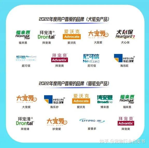 2022年度用户喜爱的品牌 宠物驱虫产品品牌 在驱虫产品品牌方面,福来恩、拜宠清、爱沃克、大宠爱、拜宠爽同时获得了“用户喜爱的品牌(犬用驱虫产品)”和“用户喜爱的”。 犬心保、超可信、尼克信、海乐旺获得了2022年度“用户喜爱的品牌(犬用驱虫产品)”;海乐妙、博来恩、妙宠爱、爱普多则拿下2022年度“用户喜爱的品牌(猫用驱虫产品)”奖项。