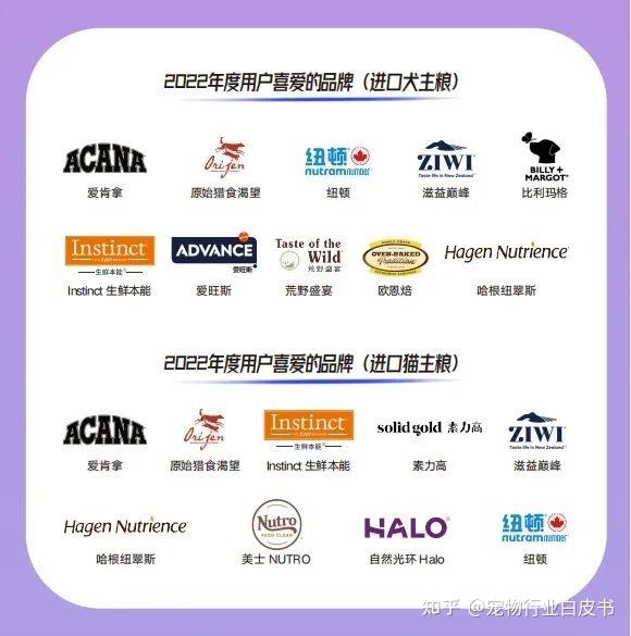 本次评选共有超过3万名宠物主人参与投票,16个奖项囊括主粮、零食、营养品、清洁洗护用品、玩具、猫砂、牵引、智能用品、连锁医院、驱虫产品等多个细分市场,共评选出了135个优秀品牌。本次奖项调研数据截止2022年12月31日,代表了消费者在2022年对宠物行业各大品牌的认知和喜爱度。 2022年度用户喜爱的品牌 进口宠物主粮品牌(犬猫) 爱肯拿Acana、原始猎食渴望、哈根纽翠斯、纽顿、滋益巅峰、Instinct生鲜本能获得2022年度“用户喜爱的品牌(进口犬主粮)”及“用户喜爱的品牌(进口猫主粮)”两个奖项。