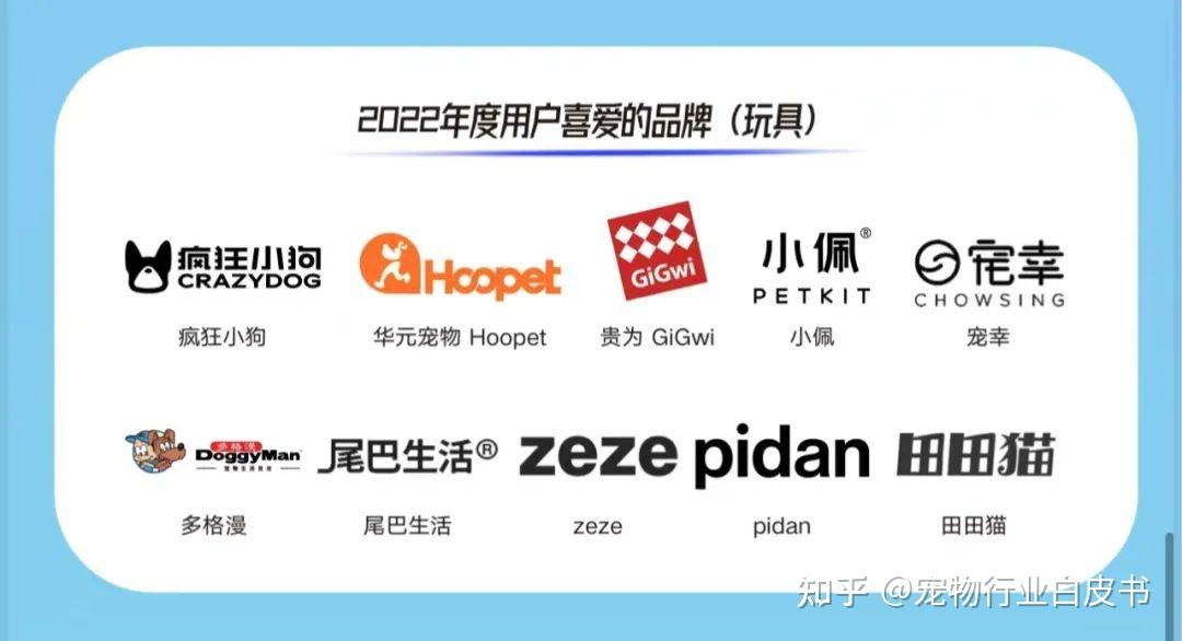 其中,猫砂是福丸的主力产品,深受广大用户的喜爱。自创办以来,福丸非常重视产品品质和客户体验,18年就自建了工厂、供应链体系和研发团队,坚持用高品质和好的服务去打动客户,并且不断研发迭代出新的猫砂产品,满足不同用户的不同需求。在“自然舒适人宠生活”的品牌理念下,除了核心品类猫砂,福丸也陆续推出了清洁系列、抓板爬架系列、出行系列等用品,满足消费者的一站式购物需求。自成立以来,福丸猫砂的渠道建设也尤为出色,主流的线上渠道与线下门店,都有福丸的产品售卖,凭借其产品的质量性价比、产品服务、商品物流等因素赢得广大顾客们的喜爱。 2022年度用户喜爱的品牌 宠物玩具品牌 在2022年度用户喜爱的宠物玩具品牌中,疯狂小狗、华元宠物 Hoopet、贵为 GiGwi、小佩、宠幸、多格漫、尾巴生活、zeze、pidan、田田猫荣获该奖项。
